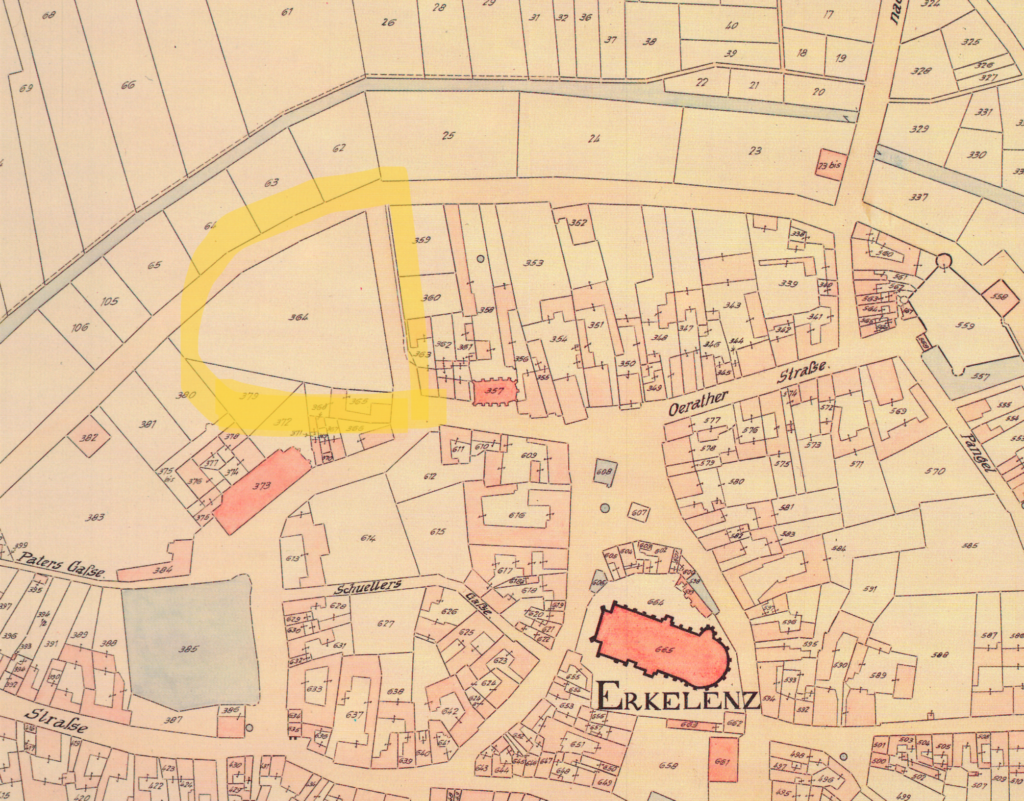 Dem Dechant und Kapitel dagegen gehören das Grundeigentum des Dorfes Erkelenz als reiner Allodialbesitz (Das Allod bezeichnete im mittelalterlichen und frühneuzeitlichen Recht ein Eigentum, über das der Eigentümer frei verfügen konnte 20), die Bestätigung der Schöffen und der zwei Anwälte (gen. Vorsprecher). Außerdem gehören dem Kapitel der große und kleine Zehnt sowie zahlreiche Naturalabgaben, z. B. Getreide.