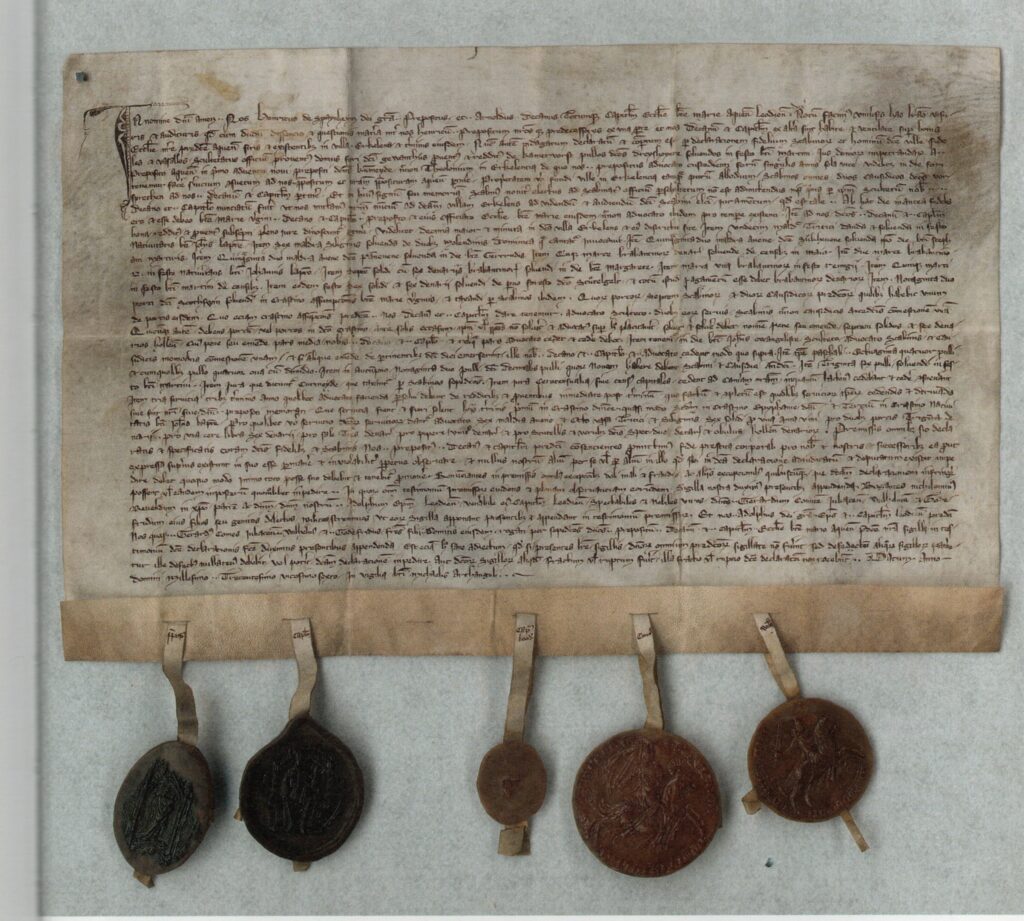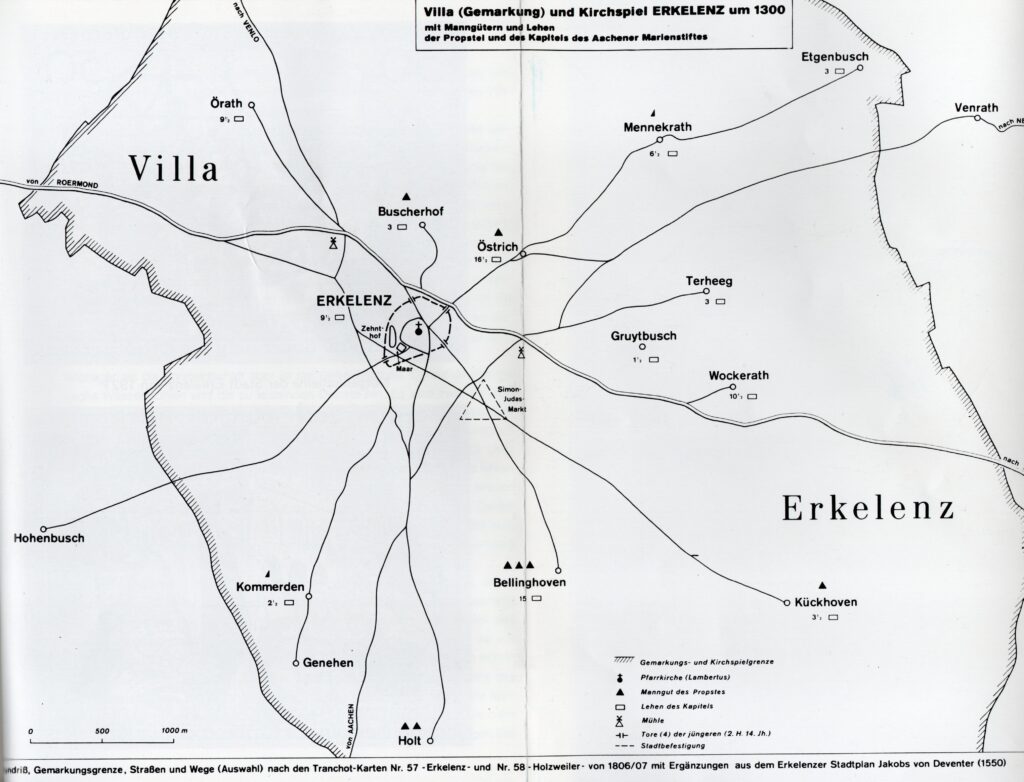 In einer Urkunde vom 28. September 132618 wird eine Aufteilung des Besitzes in Erkelenz zwischen Propst und Kapitel geregelt.19 Danach gehören u. a. dem Propst die Lehnsleute und Vasallen, die Einkünfte des Schultheißenamtes, die Einkünfte des Markthauses (gewanthus) sowie der Zoll zu Erkelenz, von dem u. a. der Vogt für die Marktaufsicht bezahlt wurde.