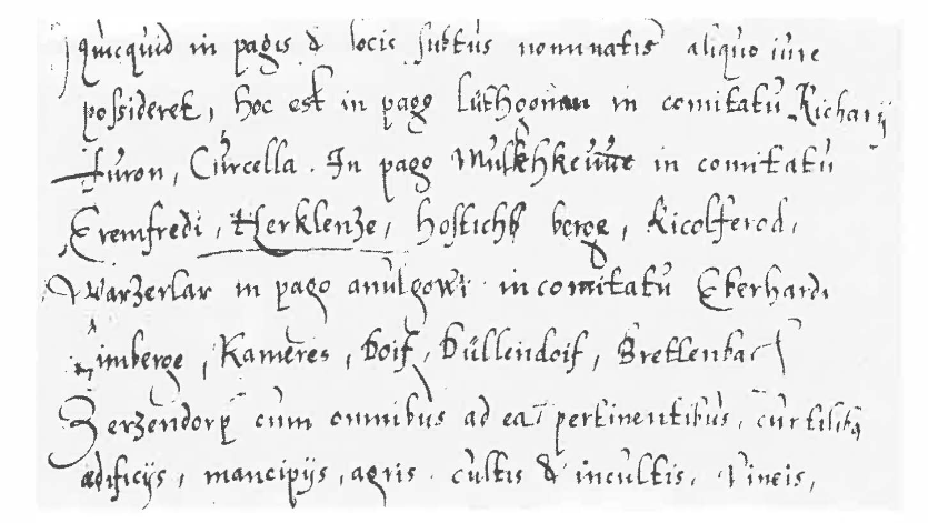 Am 17. Januar 966 erhielt das Marienstift zu Aachen durch Tausch mit dem lothringischen Grafen Immo unter anderen den im Mühlgau (Der Mühlgau lag in dem Gebiet zwischen Maas und Niers, das sich von der Niederrheinischen Bucht bis zum niederrheinischen Tiefland erstreckt.3) in der Grafschaft des Eremfred gelegenen Ort Erkelenz und den Nachbarort Oestrich. Kaiser Otto der Große bestätigte diesen Tausch in der genannten Urkunde bei einem Hoftag in Aachen. Diese Urkunde ist zugleich die erste urkundliche Erwähnung von Erkelenz. Nach dieser Urkunde übergibt lmmo dem Marienstift seinen Besitz im Mühlgau, u. a. in Erkelenz, Oestrich, Berg, Rickelrath und Watern. Im Gegenzug erhält lmmo dafür vom Aachener Marienstift den Hof Gelmen, ca. 9 km südöstlich von St. Truiden an der Straße nach Lüttich im Haspengau.