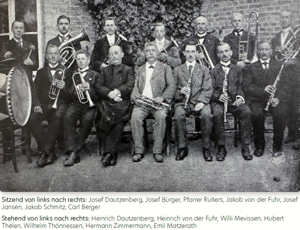 Unter Leitung des ersten Kapellmeisters Jakob von der Fuhr begannen die Proben mit insgesamt 14 Musikern. Durch den im folgenden Jahr ausbrechenden Ersten Weltkrieg wurden die musikalischen Aktivitäten aber jäh unterbrochen, denn die Musiker mussten zum Wehrdienst. Auswirkungen des Krieges waren, dass die Abteilungen der Jünglingskongregation auseinanderfielen und somit auch die Musikabteilung nicht mehr zustande kam. Viele ehemalige Mitglieder dieser Abteilung wollten aber weiter Musik machen und zur Verschönerung der örtlichen Feste beitragen. So gründete sich im Jahre 1919 aus der ehemaligen Abteilung der Jünglingskongregation der Instrumental-Musikverein unter dem Vorsitz von Wilhelm Thönnessen. Durch Geldspenden von ehemaligen Ehrenmitgliedern und die Eigeninitiative der aktiven Musiker konnten die fehlenden Instrumente beschafft werden. In der Folgezeit wurde der Instrumental-Musikverein unter der Leitung des Kapellmeisters Willi Straehnz durch sein musikalisches Können in der näheren und weiteren Umgebung zu einem gern gesehenen Gast bei weltlichen und kirchlichen Veranstaltungen. Bis zum Beginn des Zweiten Weltkrieges musizierten etwa 20 Musiker im Verein.