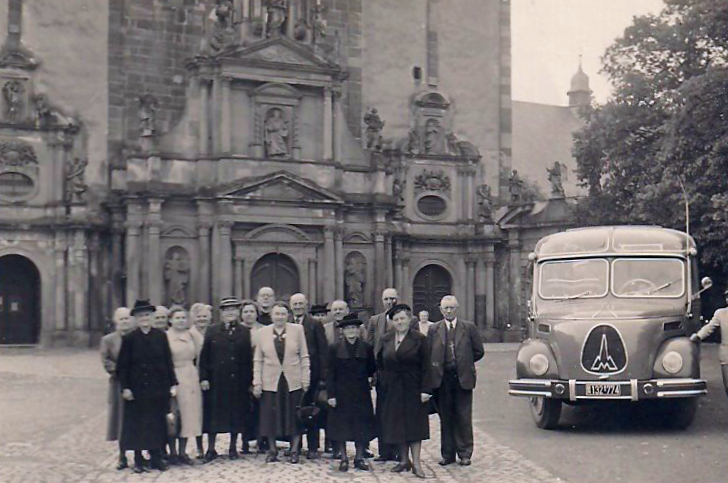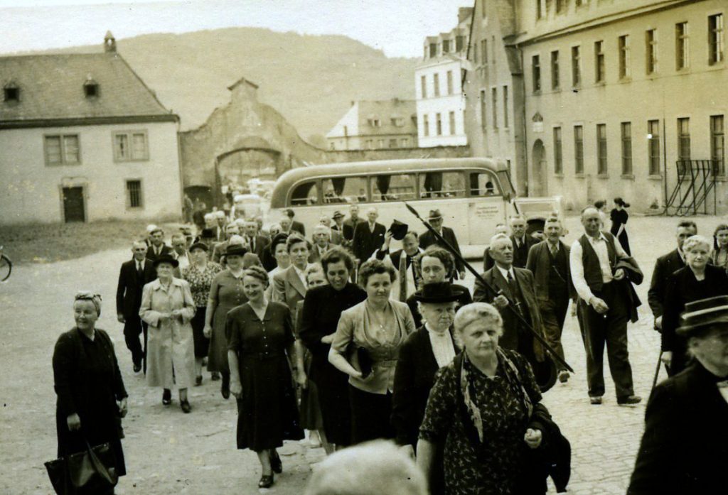 Um 4.00 Uhr in der Früh fand die letzte heilige Messe der Hinreise statt. Alsdann begannen wir unseren Abmarsch und erreichten, nachdem wir in Bitburg kurze Kaffeepause gemacht hatten, um 11.30 Uhr Kloster Helenenberg. Hier wurde zu Mittag gegessen. Wie alljährlich hatten die freundlichen Patres für ein stärkendes Mittagessen gesorgt. Dann noch ein letzter Anlauf und wir hatten um 15.10 Uhr das Kreuz vor Trier erreicht. Hier wurden wie alljährlich die üblichen Gebete verrichtet. Herr Kaplan Kaiser hielt eine Ansprache an die Pilger. An der Moselbrücke erwarteten uns die Buspilger und formierten sich zu einer gemeinsamen Prozession. So zogen wir betend und singend in die Matthias-Basilika ein und dankten Gott am Apostelgrab für die glückliche Ankunft. Am Abend fand die bekannte Lichterprozession statt. Wie ein Jubel drangen die Matthiaslieder gegen Himmel und jedem Pilger wird diese Abendstunde für immer in freudiger Erinnerung bleiben.Noch ein letzter Blick von den Höhen auf die schöne Stadt. Ein letzter Gruß an St. Matthias mit dem Versprechen „Auf Wiedersehn“ und dann geht es wieder heimwärts in vier langen Tagesmärschen. Eigenartig, je näher wir der Heimat kommen, desto stärker mischt sich in die Wiedersehnsfreude das Bedauern, dass die Wallfahrt zu Ende geht.