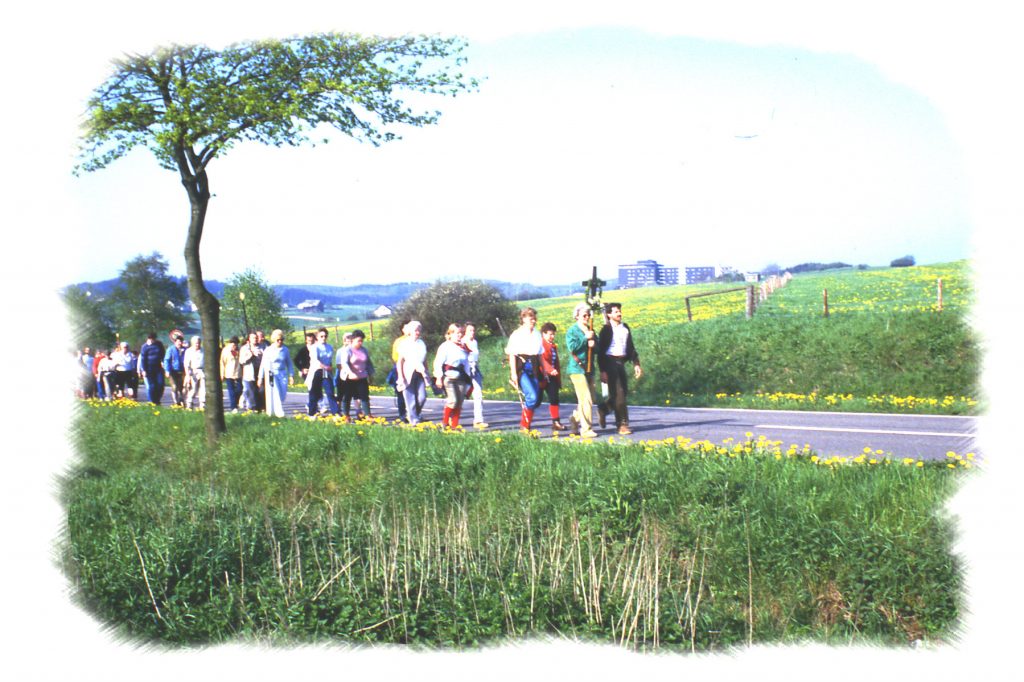 4.00 Uhr – welche von unserem Herrn Kaplan Kaiser zelebriert wurde mit frischem Mut dem zweiten Tagesziel Dahlem entgegen. Betend und singend erreichten wir um 18.30 Uhr Dahlem. Nach Erteilung des sakramentalen Segens wurden die Quartiere bezogen und mancher von uns sah die freundlichen Quartiersleute vom Vorjahr wieder. Am 3. Tag wiederum um 4.00 Uhr heilige Messe und danach Abmarsch von Dahlem über Olsheim bis Prüm, wo wir um 11.25 Uhr eintrafen und bis 13.00 Uhr Mittagspause machten. Neu gestärkt stiegen wir anschließend den Kalvarienberg hoch, um dann über Schönecken-Lasel gegen 18.30 Uhr unser drittes Tagesziel, Seffern, zu erreichen. Alle waren guten Mutes hatten wir doch schon 3 Tage hinter uns und die Hoffnung auf den morgigen Tag, am Ziel angelangt zu sein, ließ frohe Stimmung aufkommen. Nach dem sakramentalen Segen bezogen wir unsere Quartiere.