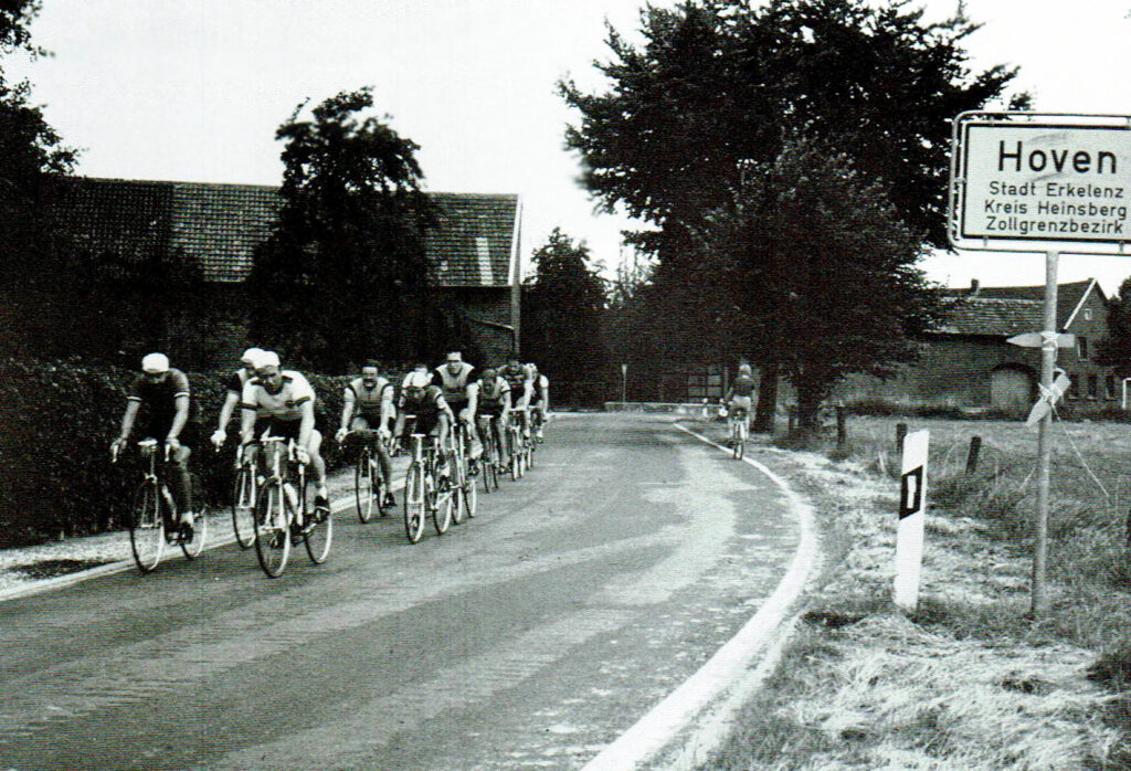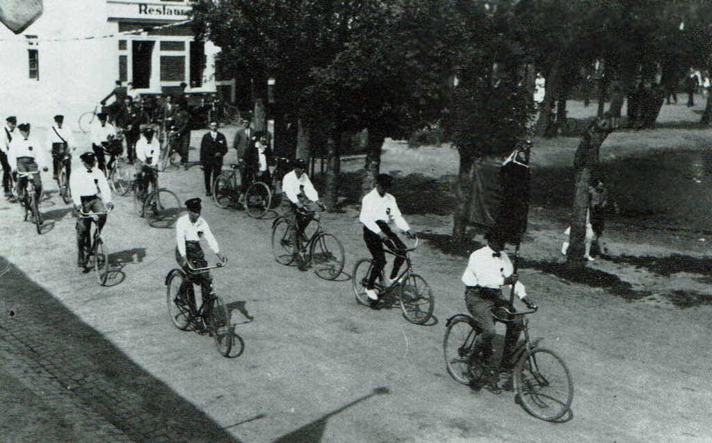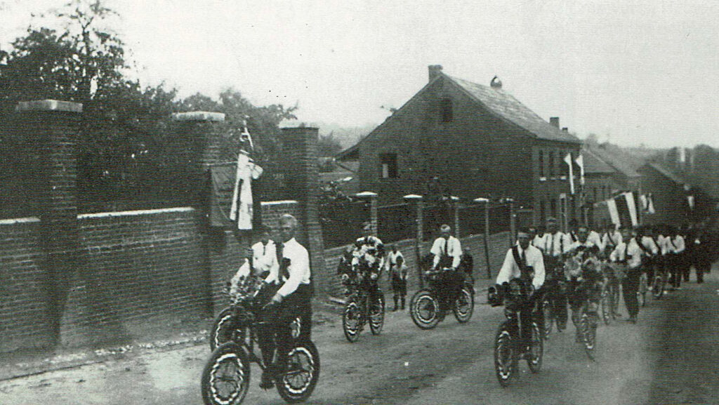 Im Vergleich zu den anderen Erkelenzer Radsportvereinen der Gründerzeit wurde der Radsportverein „Viktoria“ Hoven erst recht spät gegründet, nämlich am 1. Juni 1921. Initiator der Gründung war der Hovener Gastwirt Winand Rümers. Im gleichen Jahr beteiligten sich die Radsportler bereits am Sommerfest in Tenholt. 1926 richtete der Verein seine Standartenweihe beim 5. Stiftungsfest aus. Zu diesem Fest waren 25 Vereine geladen, die ihr Können sowohl beim Kunstradfahren als auch beim Blumenkorso durch das kleine Dorf Hoven zeigten.1 Trainiert wurde in einem Tanzsaal, dem Saal Büdding in Schwanenberg. Zur Darbietung der Fahrkünste legte man einen Holzboden aus.2 Trotz des Trainings stand nicht die sportliche Leistung im Vordergrund, sondern das gesellige Beisammensein. Man besuchte die Vereine in der Umgebung, bot den Einwohnern ihre Radkünste und den Blumenschmuck in den Umzügen und Korsos zur Erbauung an und feierte miteinander.