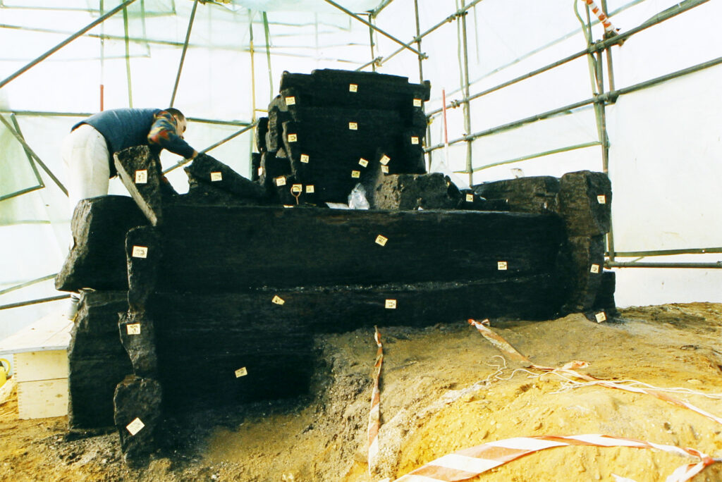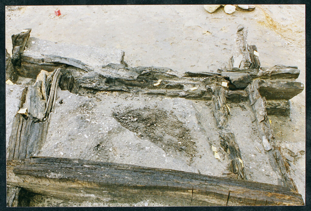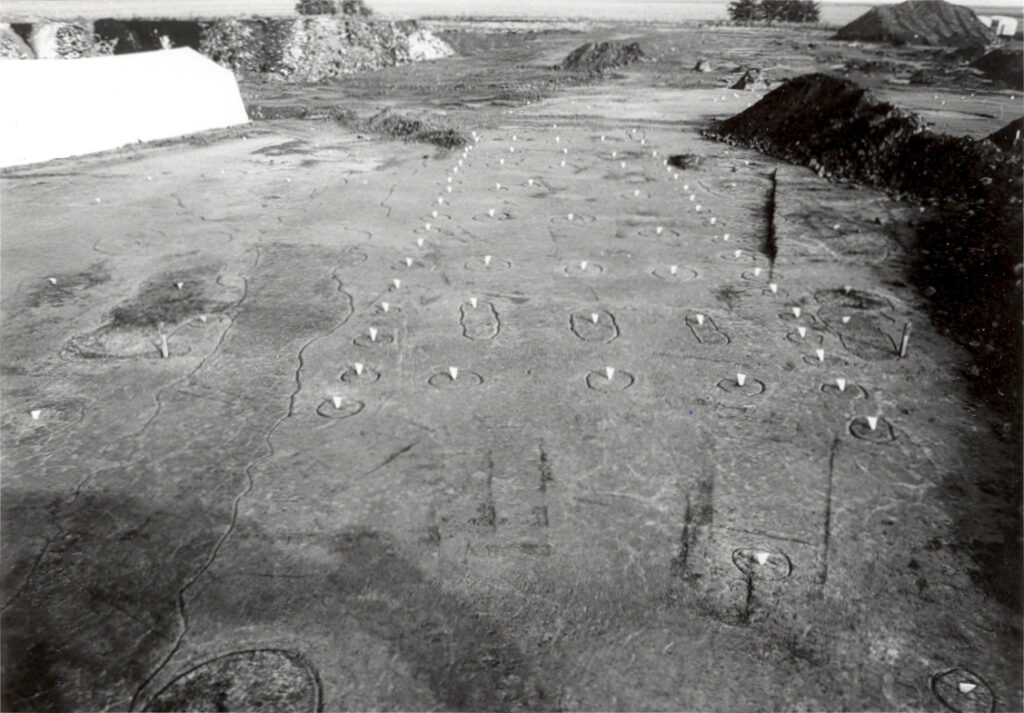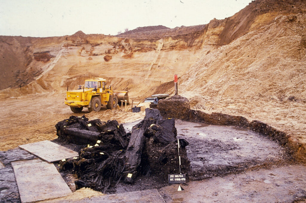 Im Jahre 1990 fand man vor Beginn der Auskiesung beim Abtrag der Lössschicht in einer Tiefe von etwa 7 Metern Hölzer, die teilweise am Ende beilartig bearbeitet schienen. Eine Radiokarbondatierung1 ergab ein Alter des Holzes von 6145 Jahren zum Zeitpunkt der Entdeckung. Somit stammten die Hölzer aus dem 6. Jahrtausend vor Christus und konnten der dort gefundenen bandkeramischen Siedlung zugeordnet werden. Im Februar 1990 konnte eine kastenförmige quadratische Holzkonstruktion freigelegt werden, die die Vermutung bestätigte, dass die zunächst gefundenen Hölzer von einem Brunnen stammten. Weitere Ausgrabungen zeigten, dass die Sohle der Baugrube erst nach weiteren 8 Metern Tiefe erreicht wurde. Mit diesem Fund konnten die Archäologen erstmals einen bandkeramischen Brunnen freilegen, „dessen Konstruktion vermutlich noch eine Erhaltung über eine Tiefe von 8 m aufwies“2. Die gut erhaltenen Stützhölzer boten gute Einblicke in die Arbeitsweise der damaligen Zeit, die Sedimentschichten enthielten Spuren der damals vorhandenen Pflanzen- und Tierwelt.