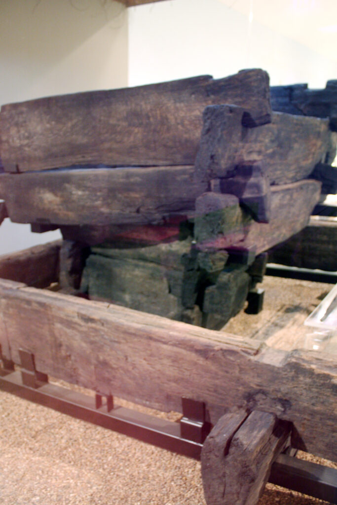 Zunächst hatte man einen Brunnenkasten mit einer Kantenlänge von 1,60 m x 1,60 m gefunden. Weitere Ausgrabungen zeigten einen zweiten Brunnenkasten mit einer Kantenlänge von 3 m x 3 m, der um den kleineren Kasten gebaut war. Alle Holzbohlen bestehen aus Eichenholz und sind in Blockbauart3 zusammengefügt. Diese Entdeckung war archäologisch deshalb interessant, da man bisher die Blockbauweise als eine Errungenschaft der späten Bronzezeit angenommen hatte. Beschädigungen des größeren Kastens ließen die Vermutung zu, dass der kleinere Kasten zur Reparatur des größeren nachträglich eingebaut wurde. Im Oktober 1991 wurde noch ein dritter Brunnenkasten in einer Tiefe von 10 Metern unter der heutigen Oberfläche gefunden. Er weist die Maße 1,10 m x 1,10 m auf. Vermutlich handelte es sich ebenfalls um eine Reparatur des 2. Kastens.4