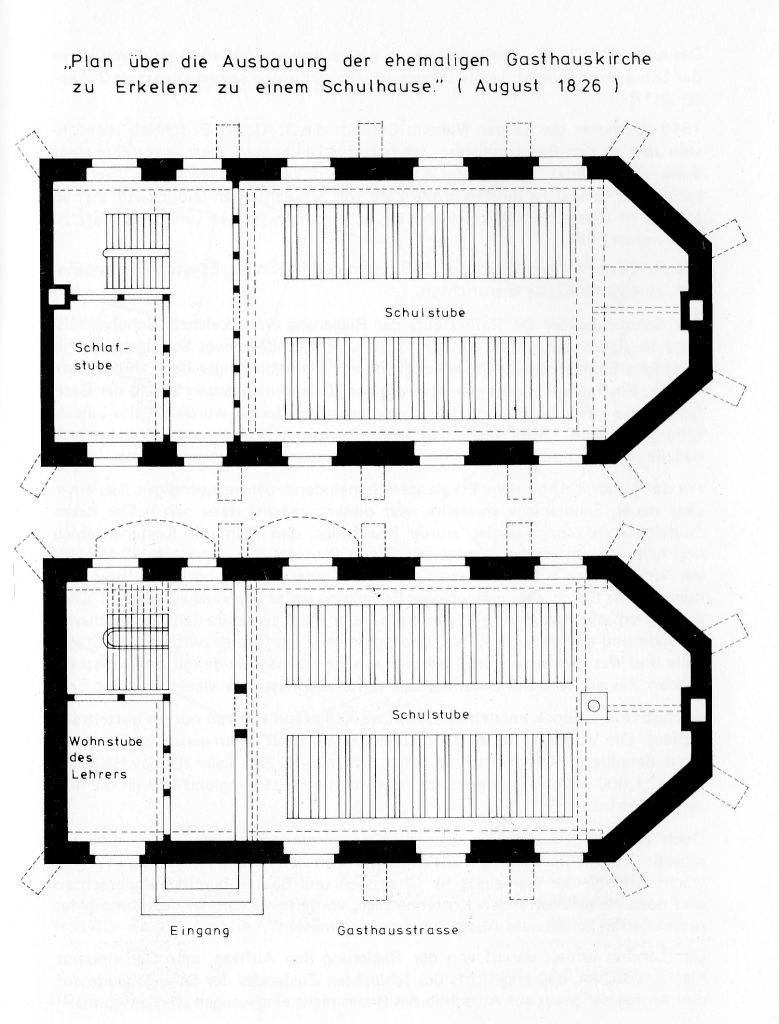 Im Jahre 1802 wurde die Kapelle von den Franzosen profanisiert, im Jahre 1825 wurden dann Gasthaus und Kapelle der Stadt Erkelenz übergeben. Im Rat der Stadt wurde schon seit 1822 darüber diskutiert, ob die ehemalige Gasthauskapelle zu einer Schule umgebaut werden sollte. Im Jahre 1827 wurde dann die Gasthauskapelle zu einer Schule umgebaut, es wurde eine Zwischendecke eingezogen, welche die spätgotische Halle zerstörte, auch wurde der Dachreiter entfernt. Entfernt wurden wohl auch die Stützpfeiler, auf Fotos in den zwanziger Jahren des vorherigen Jahhunderts sind sie nicht mehr vorhanden. Es entstanden zwei „Schulstuben“ und eine Lehrerwohnung.