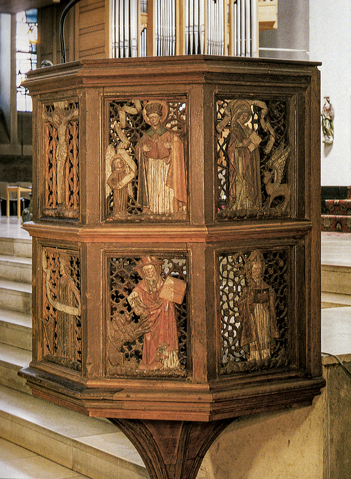 Von der Ausstattung der Leonhardskapelle ist vieles bei der Säkularisation verloren gegangen. Erhalten blieb die gotische Kanzel aus der Zeit um 1500. Der Kanzelkorb ist meisterhaft mit aus Eiche geschnitzten und farbig gefassten Reliefs der Evangelisten und Kirchenlehrer sowie mit einem Kruzifix und einer Darstellung König Davids gefüllt. Zwei Tafeln sind im zweiten Weltkrieg verschwunden.