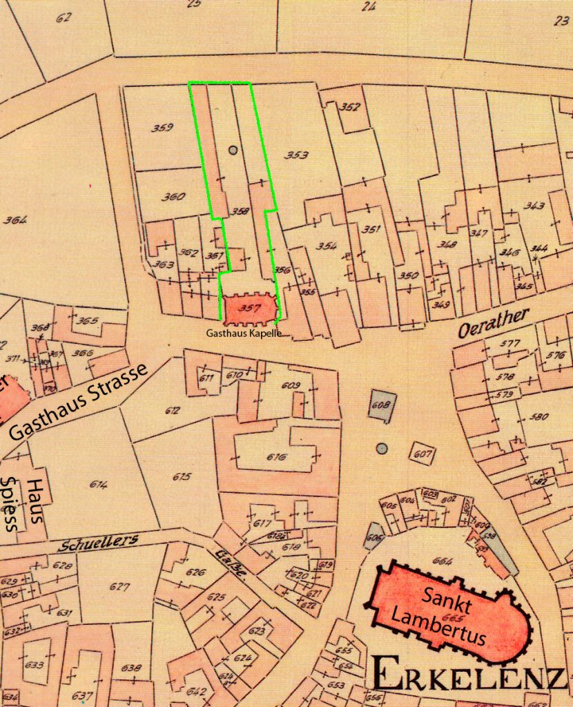 Das Gründungsdatum des Gasthauses ist nicht bekannt, erstmalig im Jahre 1452 wird das städtische Gasthaus in Erkelenz urkundlich erwähnt, hat aber mit Sicherheit schon vorher existiert. Erkelenz hatte ab 1326 die Stadtrechte und es gibt Hinweise, dass es in der Stadt schon früh eine „Armenkommission“ gab. Stiftungen für Arme sind im 15. Jahrhundert belegt, z. B. die von Peter Wimar.2 Auch die Lage an der Fernstraße Köln – Roermond – Antwerpen lässt ein hohes Aufkommen an Pilgern und Reisenden vermuten, so dass auch aus dieser Sicht ein Bedarf bestand.3