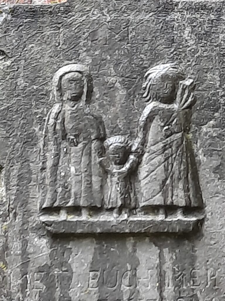 „Höhe 1,15 m; Breite 1,05 m; Blaustein. Abgerundete Nasen an den Balkenenden, Winkelstützen in der Vierung und eine Menschengruppe (Eltern mit Kind) als Relief sind besondere Merkmale dieses (…) Kreuzes.“2 Unterhalb des Reliefs steht eine Inschrift in Großbuchstaben.
