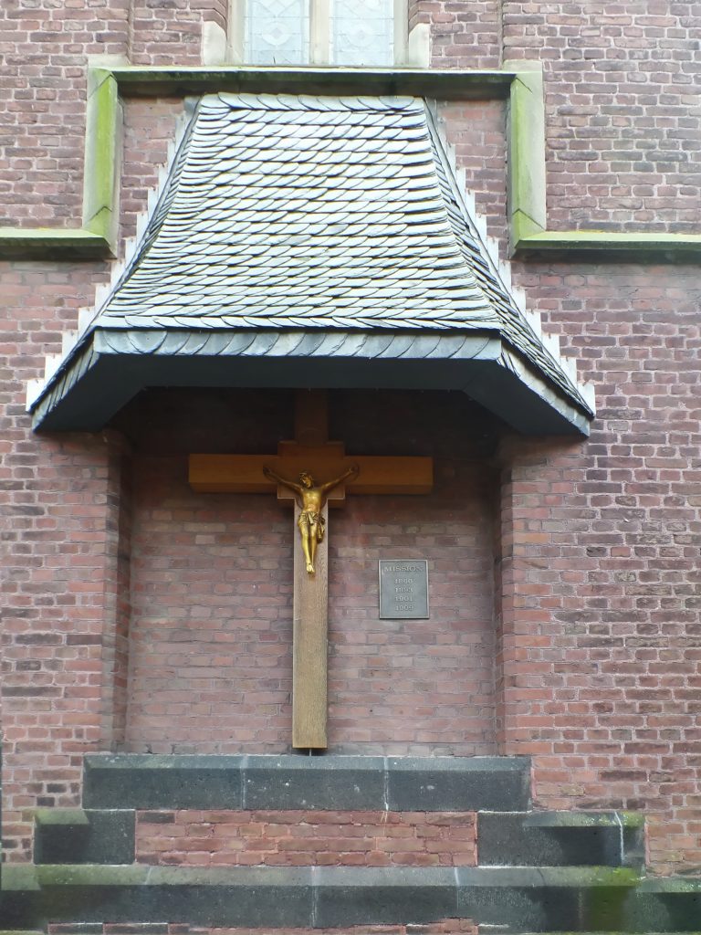 Das genaue Entstehungsjahr des an der Portal-Außenfassade hängenden Kreuzes der Heilig Kreuz Kirche in Keyenberg lässt sich nicht genau feststellen. Entsprechend den Eintragungen muss es 1866 oder früher entstanden sein.