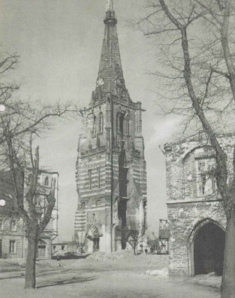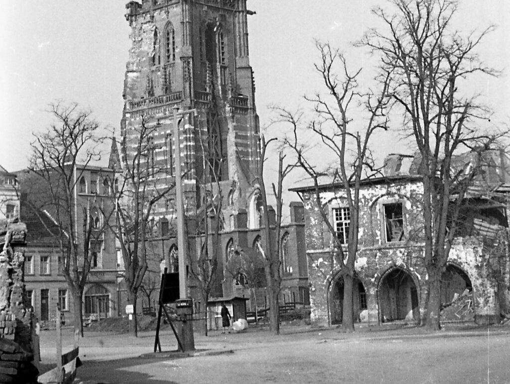 Bei dem schweren Bombenangriff am 23. Februar 1945 wurden die Kirche, das Alte Rathaus und viele Gebäude am Markt zerstört bzw. schwer beschädigt.