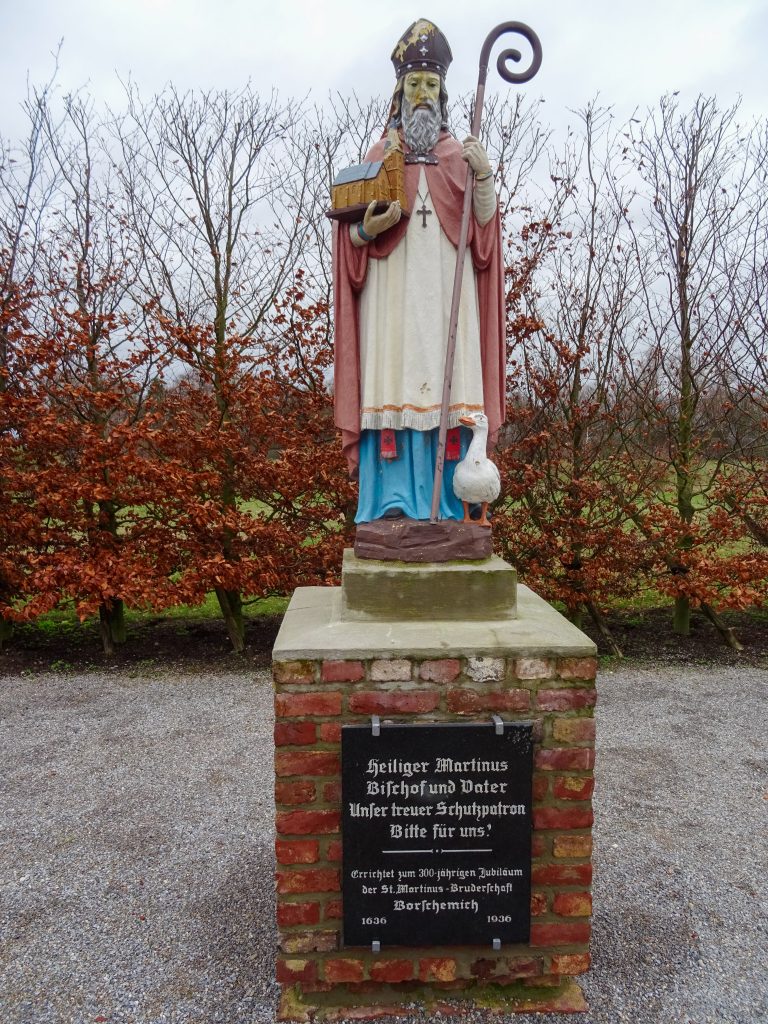 Die lebensgroße Holzfigur des Heiligen Martin (1,70 m hoch) stand auf einem 1,35 m hohen Beton-Sockel. Sankt Martin trägt den Hirtenstab als Symbol des Bischofs und eine Kirche als Indiz für seine Funktion als Pfarrpatron. Eine Gans, wie sie in der Legende um den Heiligen vorkommt, steht an seiner linken Seite. Die Inschrift verweist auf den Anlass der Errichtung: die 300-Jahr-Feier der Sankt-Martinus-Schützenbruderschaft.
