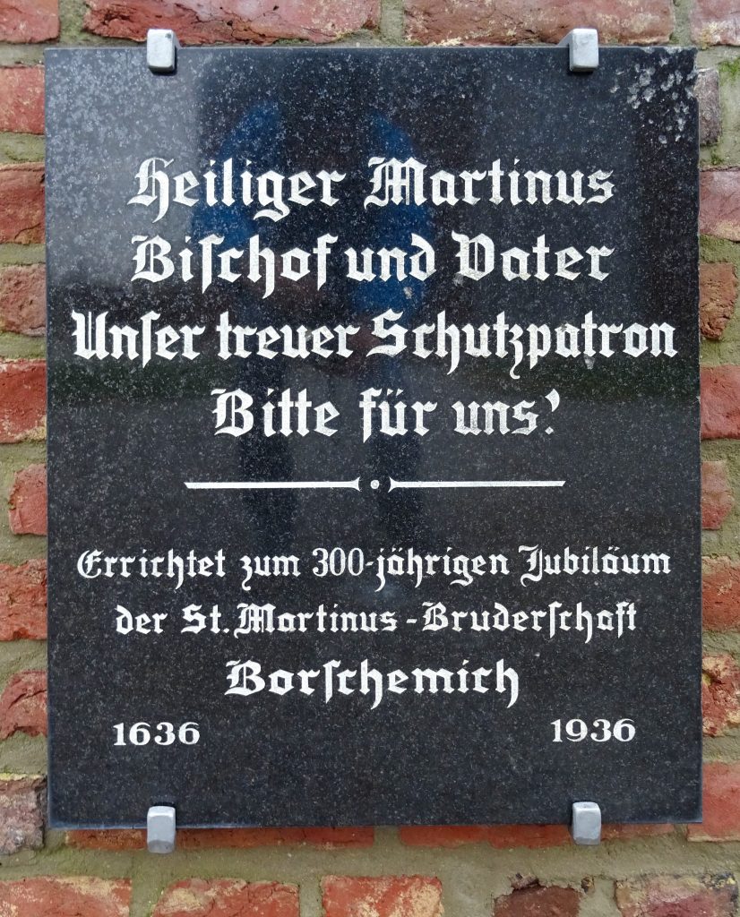 Die Pfarrkirche in Borschemich ist dem Heiligen Martin geweiht. Es lag also nahe nicht nur in der Kirche, sondern auch in der Anlage hinter der Kirche diesem Heiligen ein Denkmal zu setzen. Beim Umzug in den neuen Ort wurde auch diese Statue mitgenommen und an der Kapelle in der Nähe der übrigen Grottendenkmäler wieder aufgebaut.