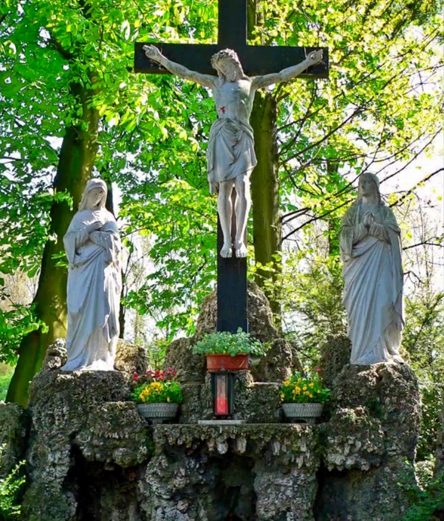 Diese Grotte wurde am 03.09.1922 in der Anlage an der Pfarrkirche eingeweiht. Das massive Eichenkreuz war ein Geschenk der Familie Gerhard Bohs. Neben dem gekreuzigten Christus standen Maria und Johannes. Palmsonntag versammelten sich die Gläubigen vor der Kreuzigungsgruppe.