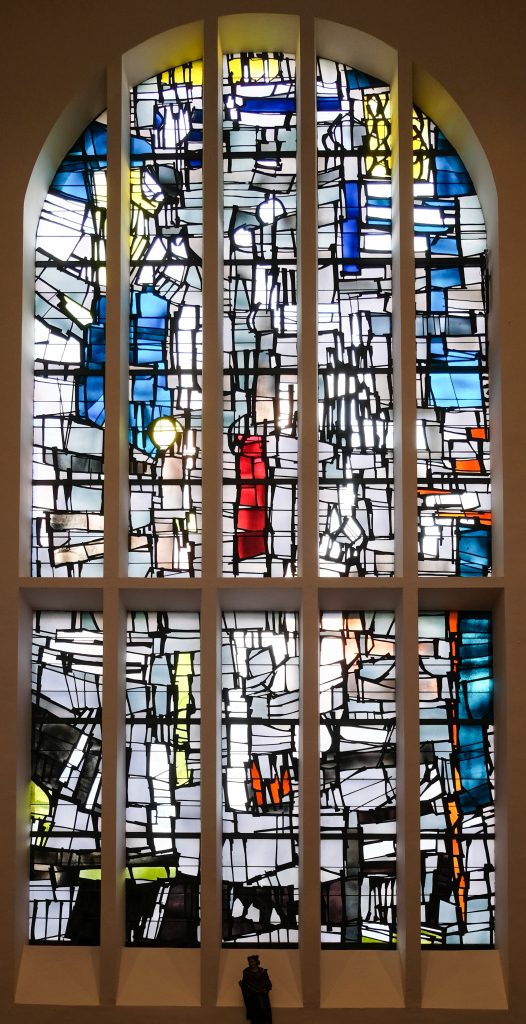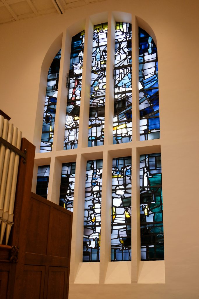 Hinter dem Zelebrationsaltar befindet sich eine neunteilige Gruppe von schlanken, hohen Rundbogenfenstern, die von Ludwig Schaffrath, einem Bildhauer und Kirchenfenstermaler aus Alsdorf stammen. An den Seitenwänden findet man noch 3 dreiteilige breite Fenster von Klaus Iserlohe. Alle Fenster besitzen eine moderne Grisailleornament-Verglasung. Sie entstanden im letzten Drittel des 20. Jahrhunderts38 Die dreigeteilten Fenster greifen das Schöpfungsthema auf, die Fenster in der Apsis haben die „neue Schöpfung“ zum Thema.39 40