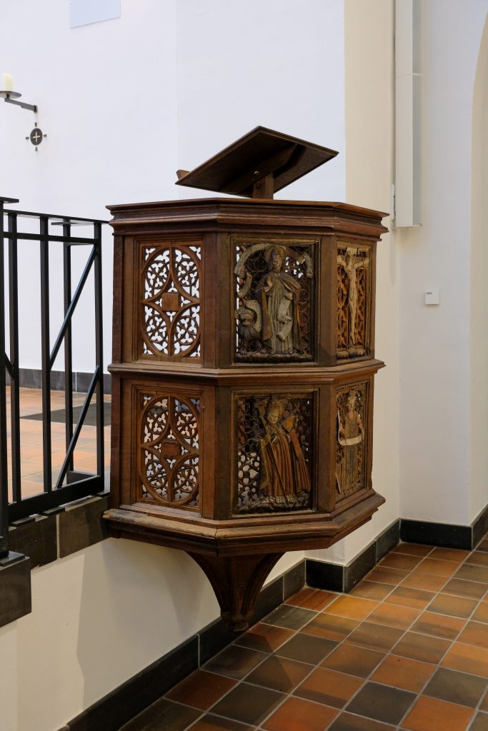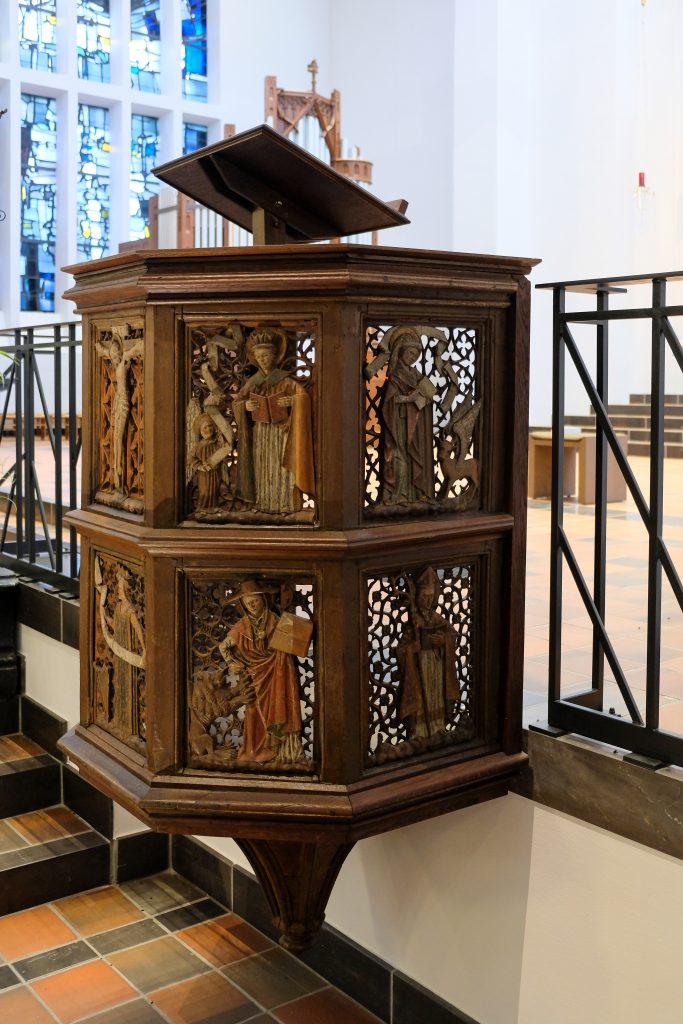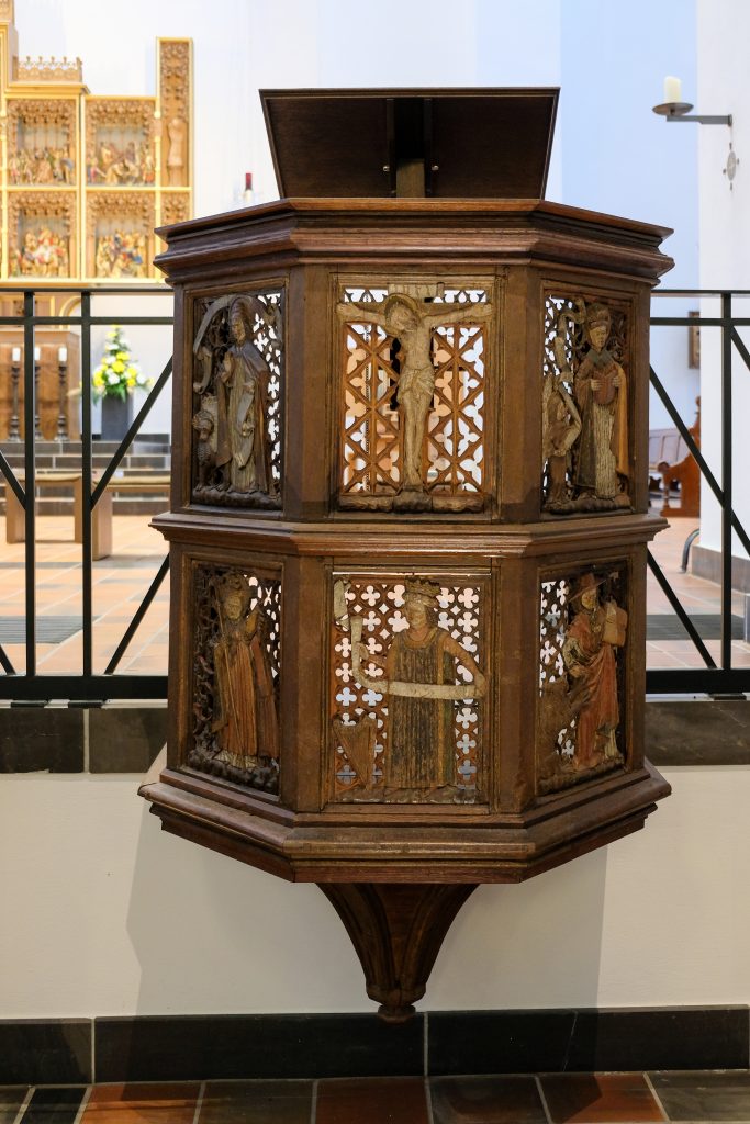 Die Kanzel besteht aus fünf Seiten eines Achtecks. Die Seiten sind zweigeteilt und besitzen einen Maßwerkhintergrund. In diesen Teilen sind bzw. waren 12 Figuren als Flachreliefs dargestellt. Das mittlere obere Fach zeigt den Gekreuzigten. daneben standen früher die vier Evangelisten, heute sind es nur noch drei: Markus, Lukas und Matthäus. Im mittleren unteren Fach wird König David dargestellt, daneben Kirchenlehrer, von denen zwei als Hieronymus und Papst Gregor erkannt wurden.14