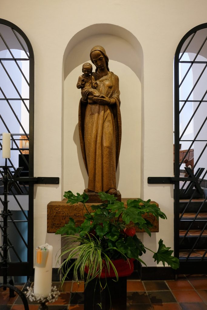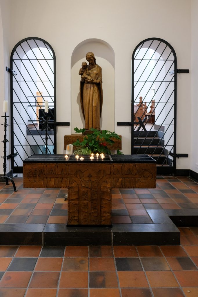 Der Marienaltar steht an der Ostwand des südlichen Seitenschiffs. Er besteht aus einem Opfertisch und einer Madonnenstatue mit Kind. Die lebensgroße Madonna aus Lindenholz stammt von Franz Xaver Haak, einem Erkelenzer Bildhauer. Er schuf sie in den 1930er Jahren. 1936 wurde sie in die Inventarlisten der Kirchengemeinde eingeschrieben. Der Kunststil folgt „zurückhaltend expressionistischen Vorbildern“6. Die schlanke Figur wirkt fast mädchenhaft, die Haltung des Kindes erinnert an einen „Salvator Mundi“7. Die Realistik wird durch „starke Vereinfachungen sowie starke Stilisierungen“ aufgebrochen.8