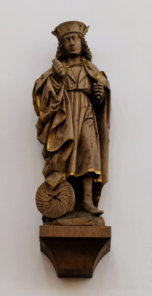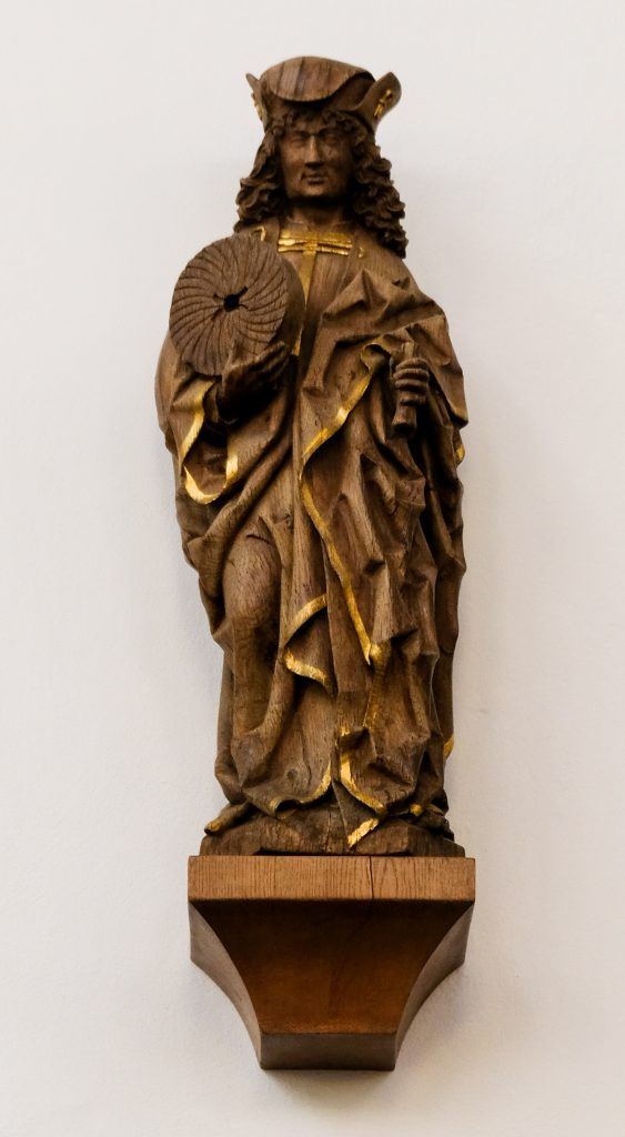 Diese Figur hängt an der Westwand des Südschiffes neben der Turmhalle. Sie soll um 1520 in der maasländischen Bildhauerwerkstatt von Meister von Elsloo entstanden sein. Der Figur fehlt die linke Hand. Coester vermutet, dass er darin einen Stab gehalten habe.25 Ob es sich um den Heiligen Andreas handelt, ist ebenfalls nicht sicher. Sie soll bis 1950 in der Karlskapelle in Östrich gestanden haben. Paul Clemen beschrieb die Figur als den Heiligen Nicasius.26