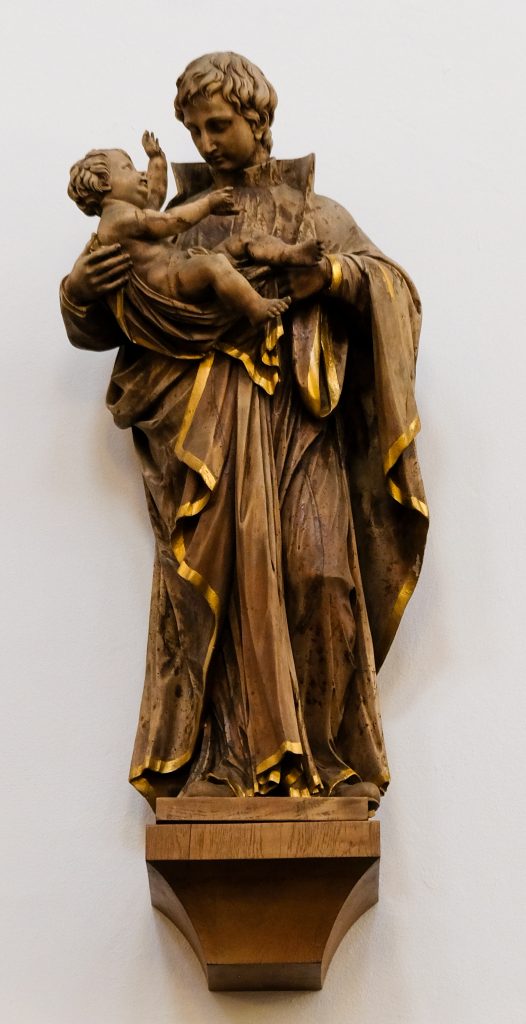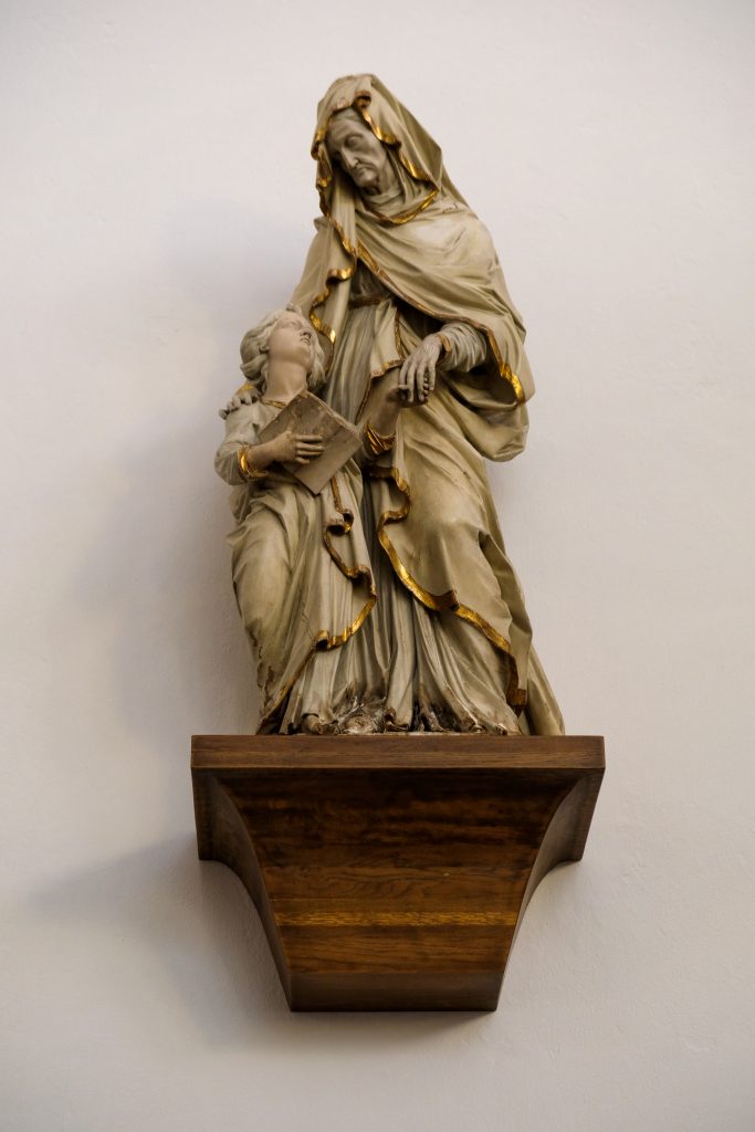An der Westwand hängt die Figurengruppe der Heiligen Anna und Maria. Diese Figurengruppe besteht ebenfalls aus Holz und entstand wohl in der 1. Hälfte des 18. Jahrhunderts. Maria wendet sich mit einem Schulbuch in der Hand Rat suchend an ihre Mutter.24
