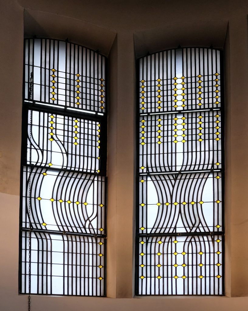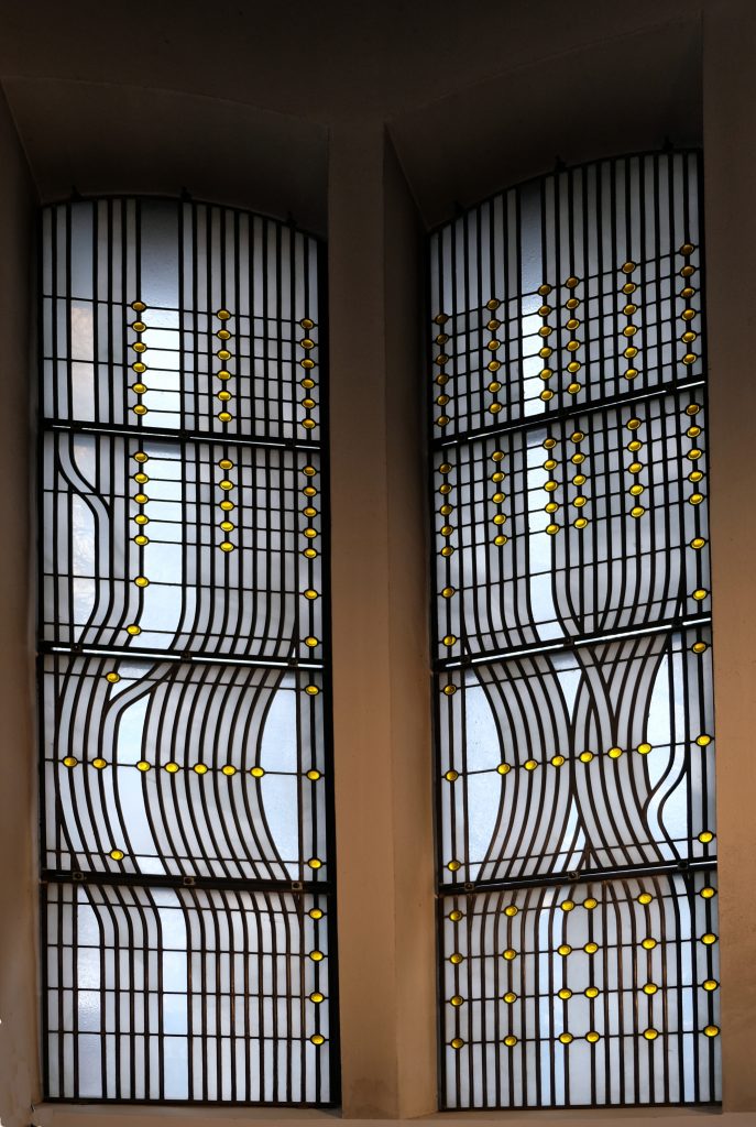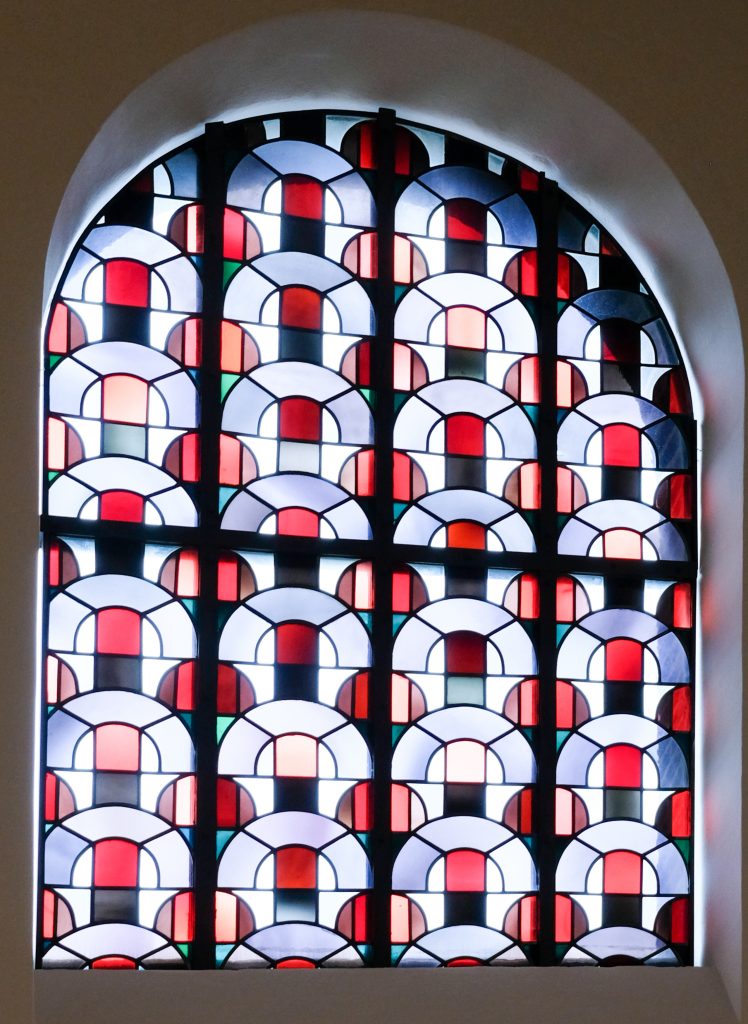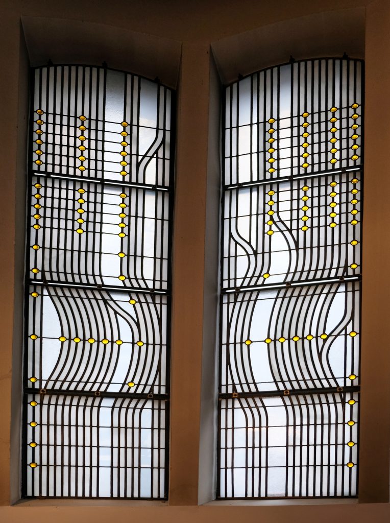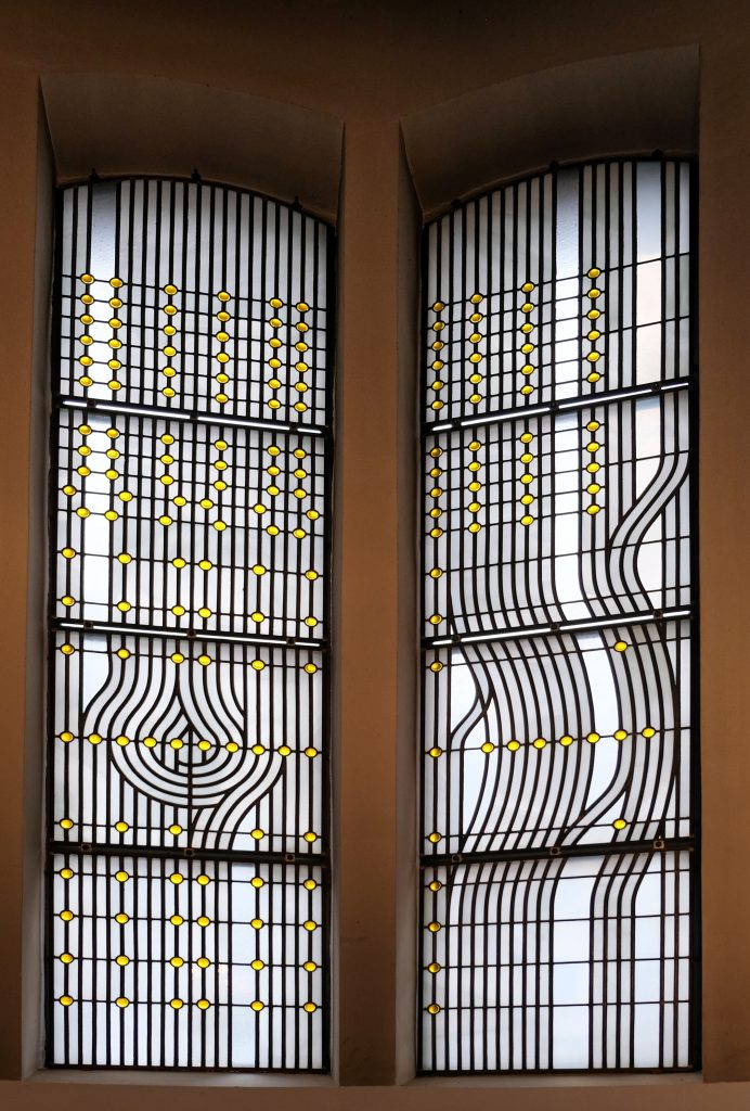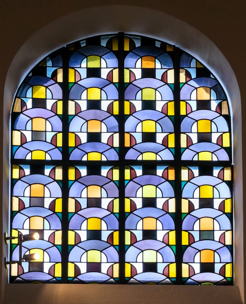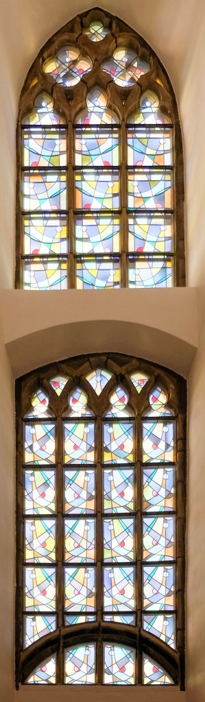 Die Glasfenster umfassen 3 Gruppen: die 4 Blockfenster an den Seitenwänden, die Fenster des Obergadens und die Fenster im Hauptturm.