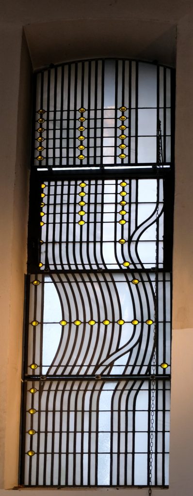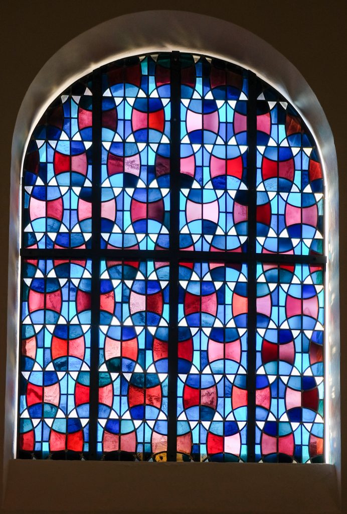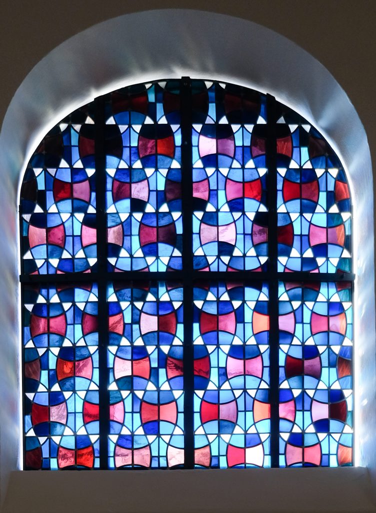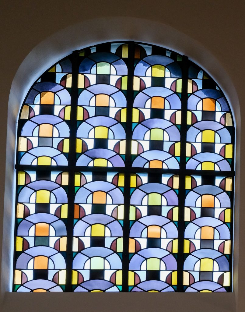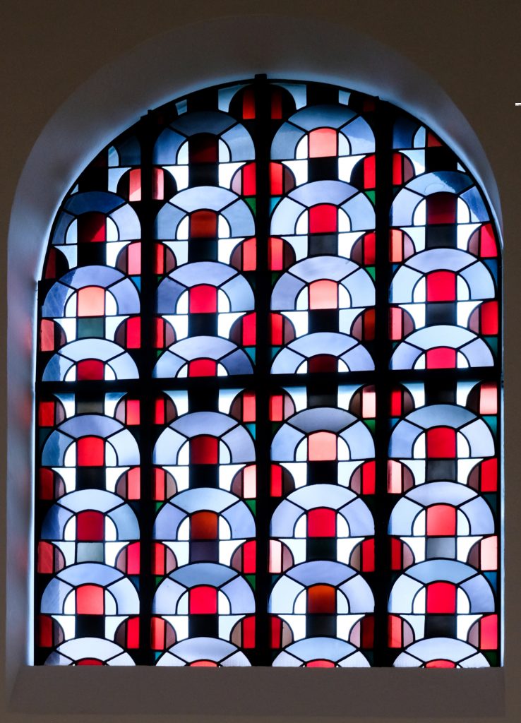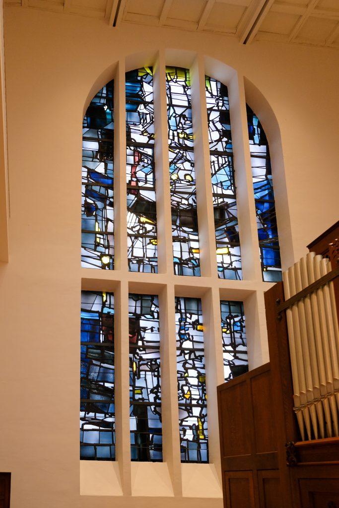 Die Glasfenster umfassen 3 Gruppen: die 4 Blockfenster an den Seitenwänden, die Fenster des Obergadens und die Fenster im Hauptturm.