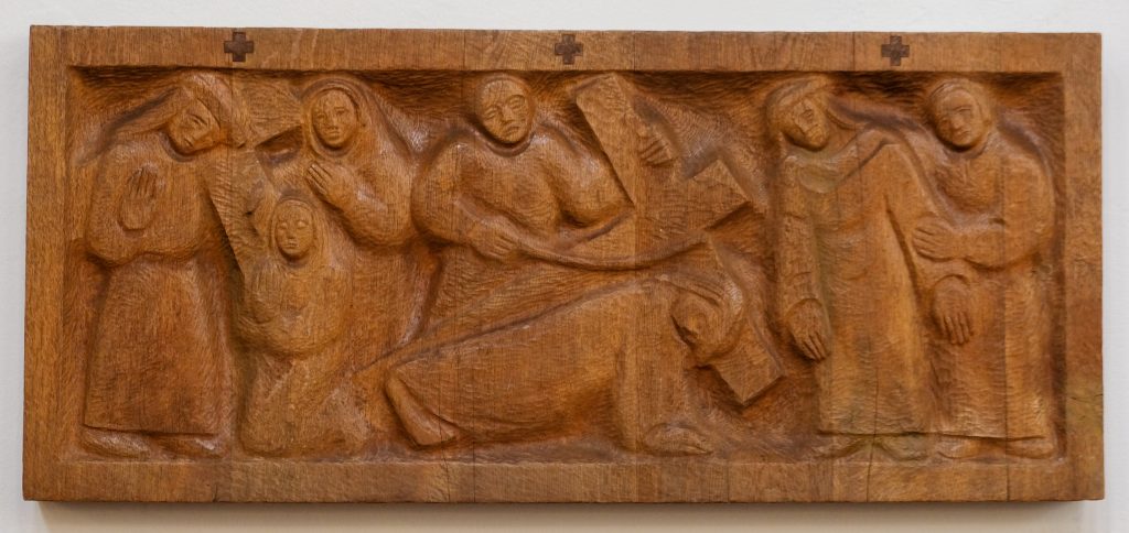 Peter Haak aus Erkelenz schuf im Jahre 1953 die auf 6 Holztafeln dargestellten 14 reliefartigen Kreuzwegstationen für die Pfarre St. Stephanus Kleingladbach, wo sie bis 1994 hingen. Im Jahre 2000 kamen sie in die Sankt Lambertus Kirche nach Erkelenz. Auf vier Tafeln befinden sich je zwei Stationen, auf 2 Tafeln je drei. Die einzelnen Gestalten sind „bis ins Archaische vereinfacht, wobei insbesondere ihre Antlitze an expressionistische Bildwerke von K. Kollwitz und E. Barlach erinnern“28. Sie hängen an der Nordwand rechts und links neben dem Kreuz tragenden Christus unter den beiden Blockfenstern.
