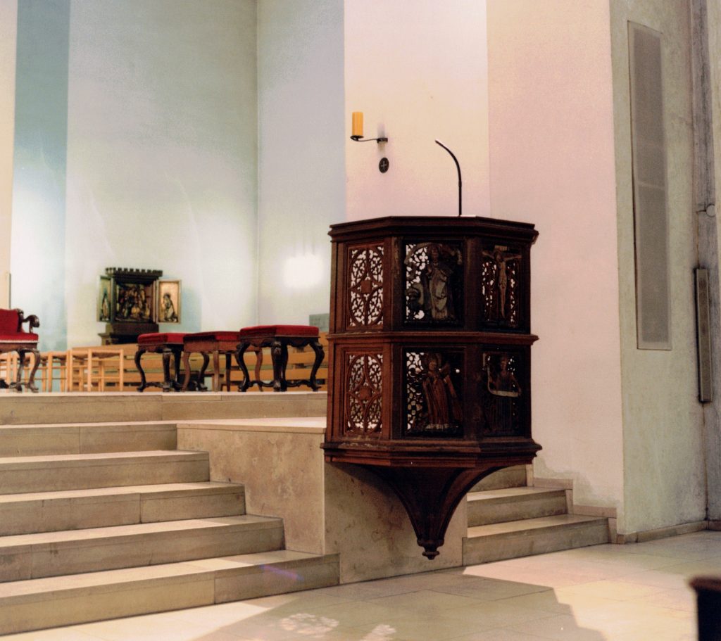 Für die Vorlesetexte des Priesters schaffte Karl Iserlohe ein Holzambo. Quer über die gesamte Fläche steht ein Zitat aus dem Matthäusevangelium: „DENN WAS WIRD ES DEM MENSCHEN NÜTZEN WENN ER DIE GANZE WELT GEWINNT ABER SEIN LEBEN VERLIERT? MT 16, 26“