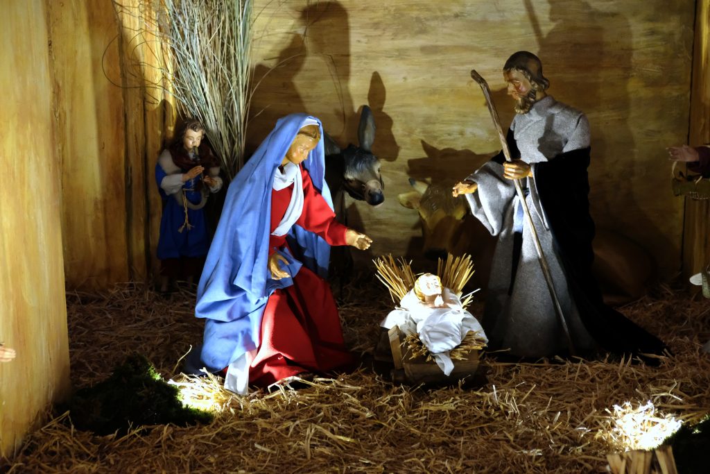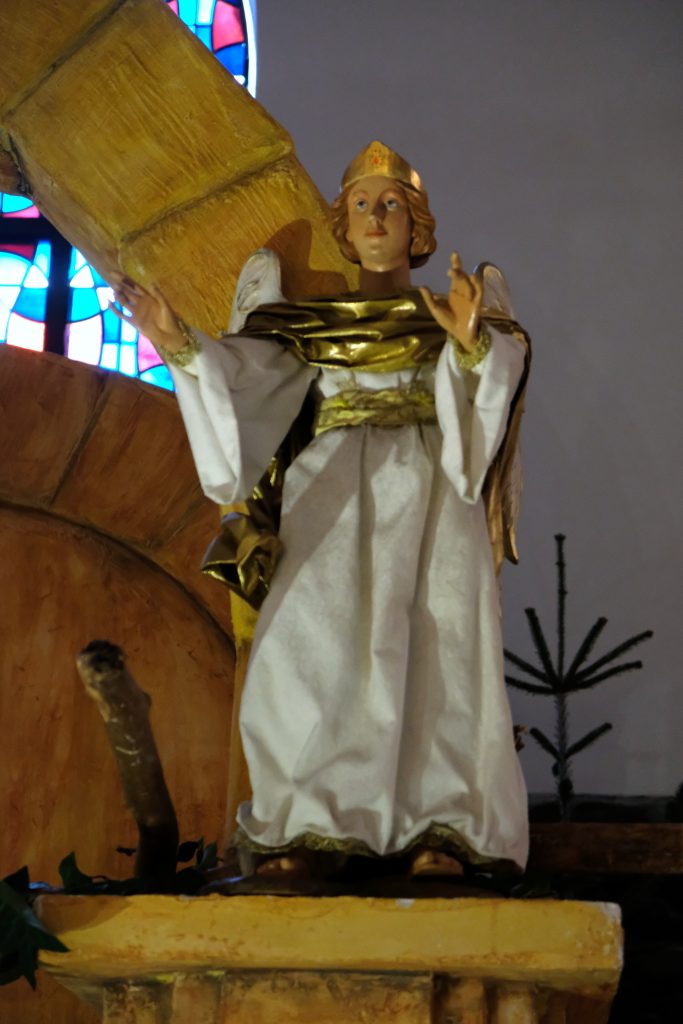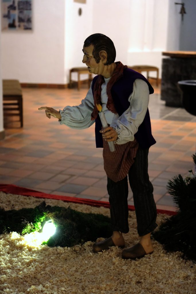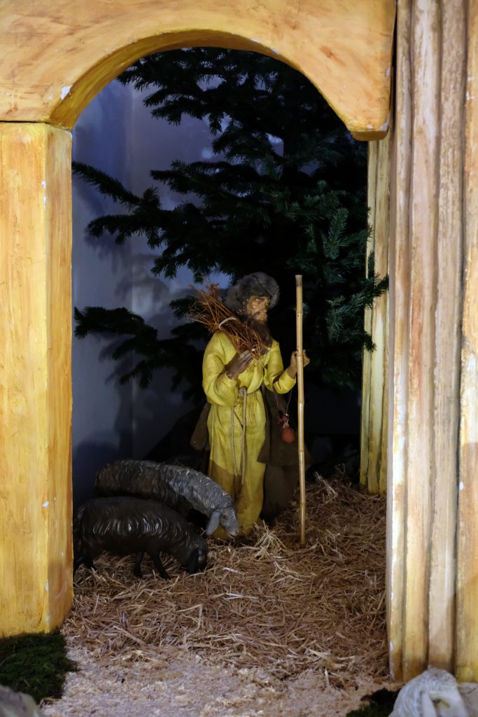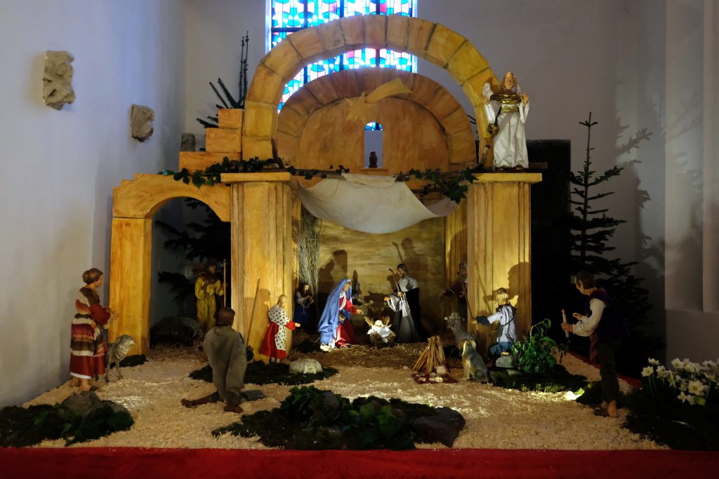 Bis zur Errichtung des Flügelaltars 1989 stand die Krippe auf einem Podest hinter dem Altar unter der Kreuzigungsgruppe an der Chorwand. Steitdem steht sie unmittelbar vor der Matthiasfigur, die für die Weihnachtszeit entfernt wird.31
