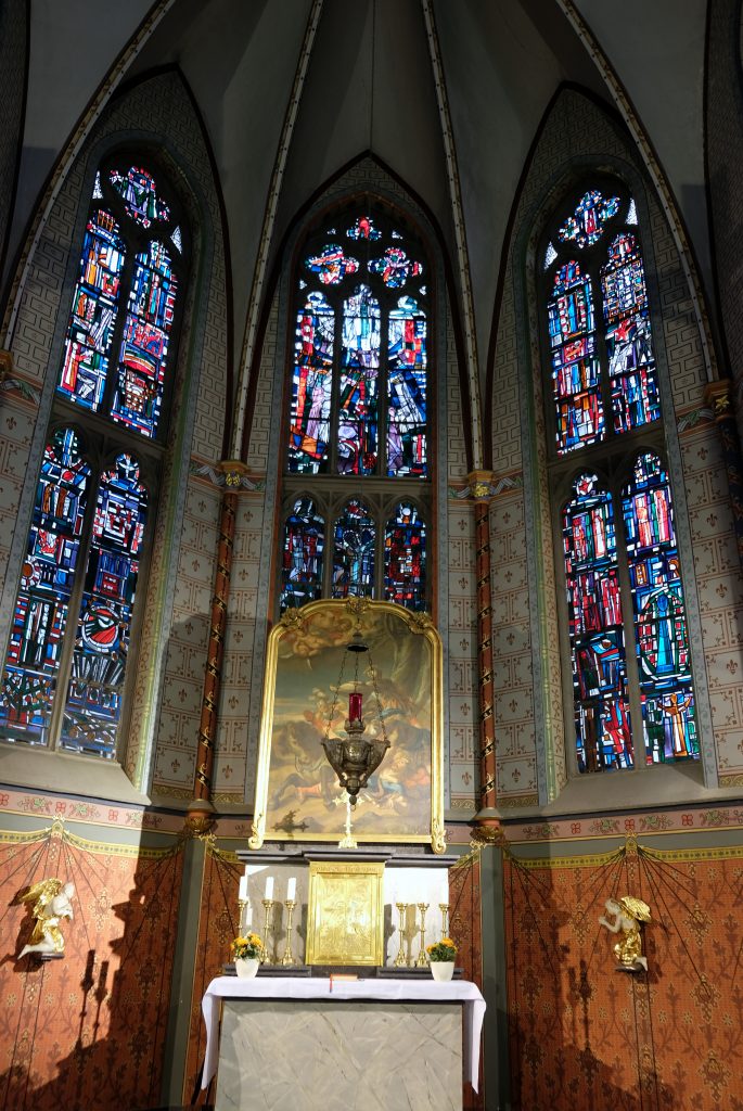 Im Chorraum hängen 5 Fenster. Die 3 hinter dem Hochaltar haben bildliche Motive, die beiden anderen sind abstrakter Natur. Das linke Fenster hinter dem Hochaltar zeigt „das Heilswesen Gottes im Volke Israel„, das mittlere „das Heilswirken Gottes in der Menschwerdung Christi“ und das rechte „das Heilswirken Gottes im Leben der Kirche„. Alle Chorfenster stammen aus dem Jahre 1957.