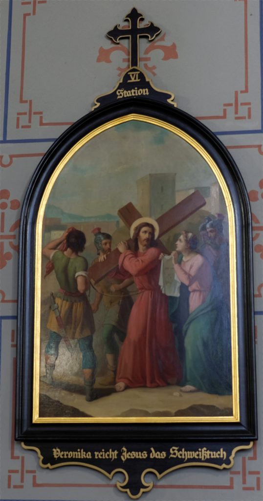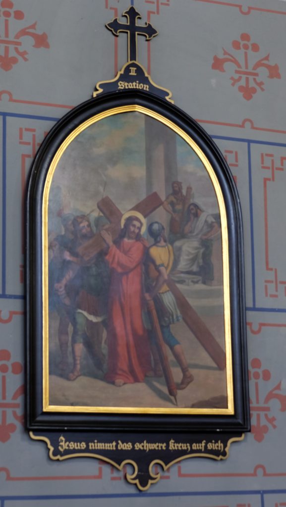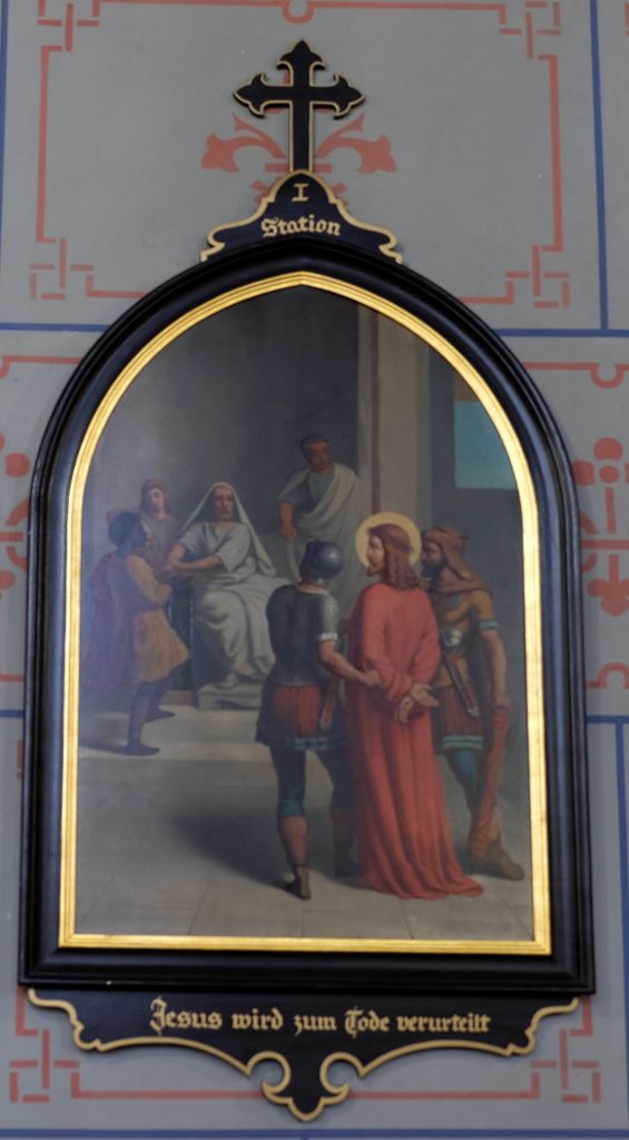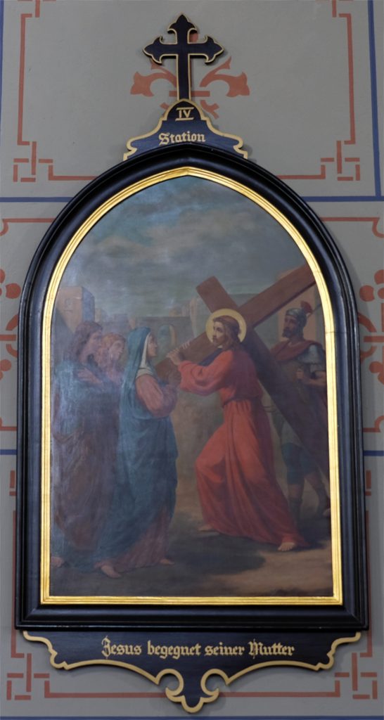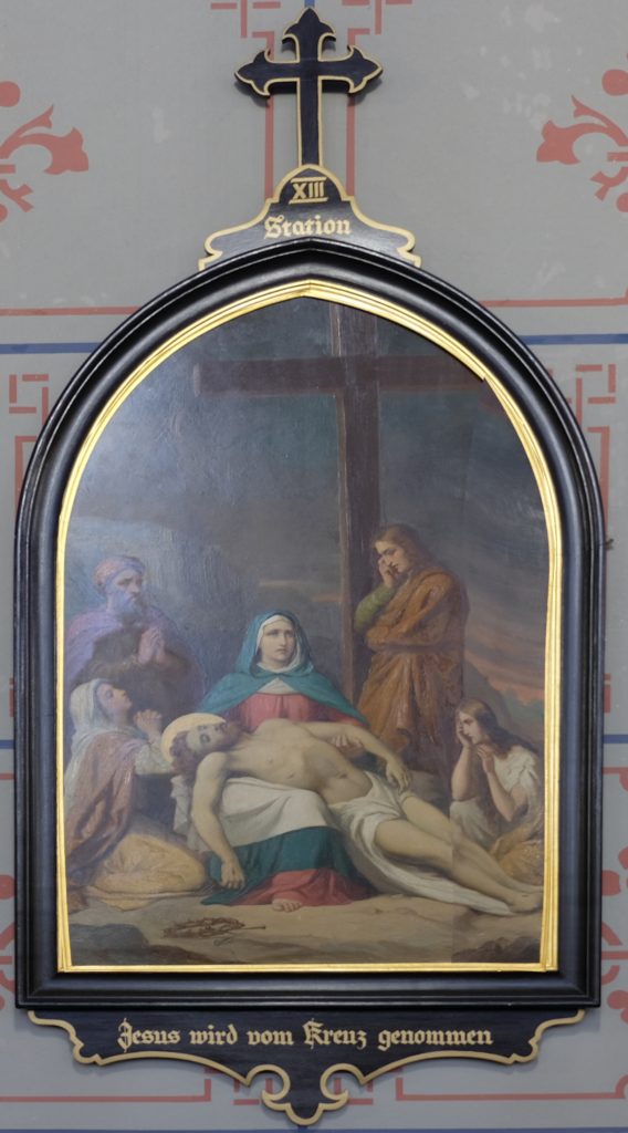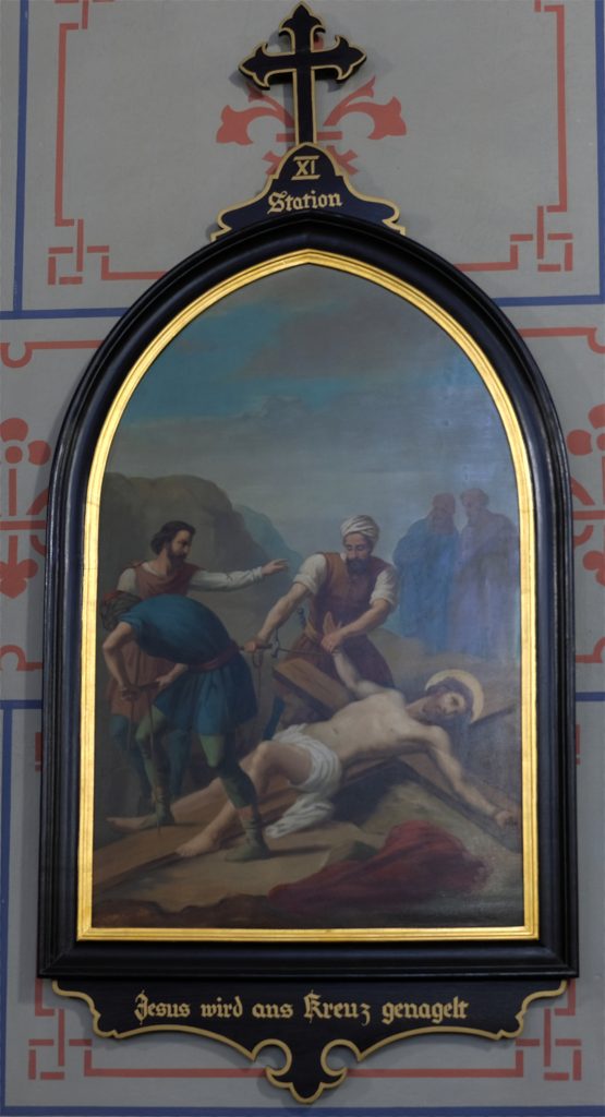 An den Seitenwänden und der Rückwand verteilt hängen 14 Kreuzwegstationen. Alle haben die Maße 96 x 62 cm und sind in einem Holzrahmen mit einem Spitzbogen eingefasst. Der unbekannte Künstler hat sie frei nach einer französischen oder deutschen Vorlage in Öl auf unbekanntem Blech gemalt. Wahrscheinlich entstanden sie in der 2. Hälfte des 19. Jahrhunderts und waren in einer wallonischen Kirche untergebracht. Die Pfarrgemeinde in Lövenich erwarb sie in der 2. Hälfte der 1980er Jahre.
