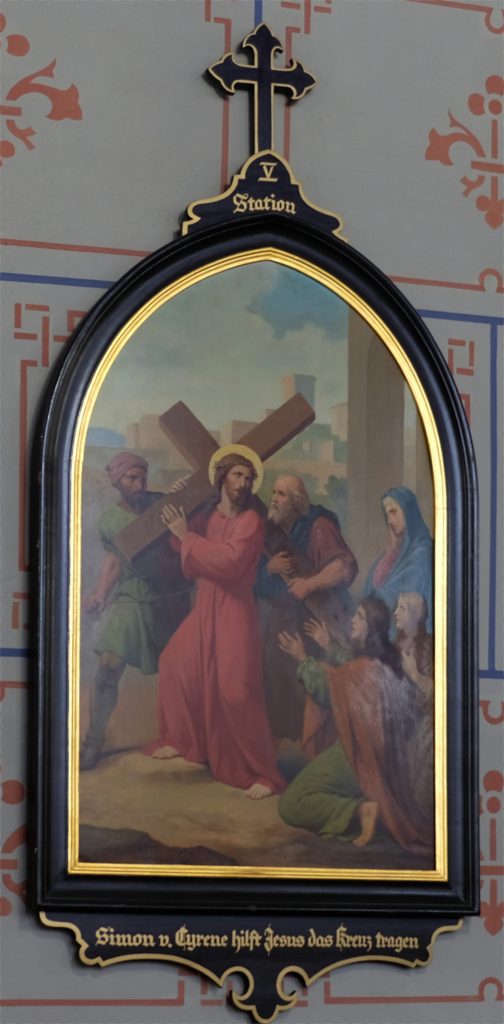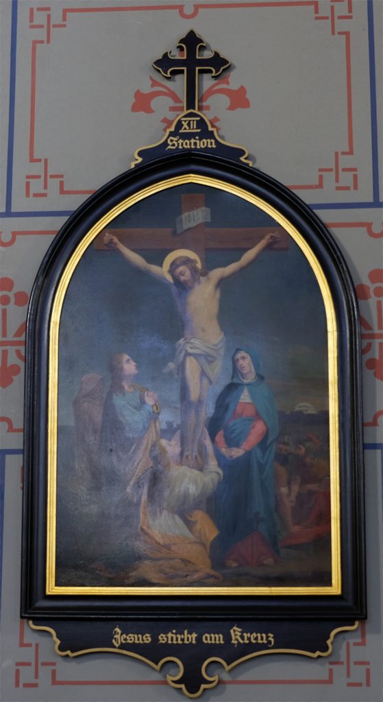 Über dem Altar der Krypta hängt ein ehemaliges Wandkruzifix aus Buntmetallguss. An den 4 Enden befinden sich je drei Blumenmotive. Das neugotische Kreuz stammt vom Ende des 19. Jahrhunderts.