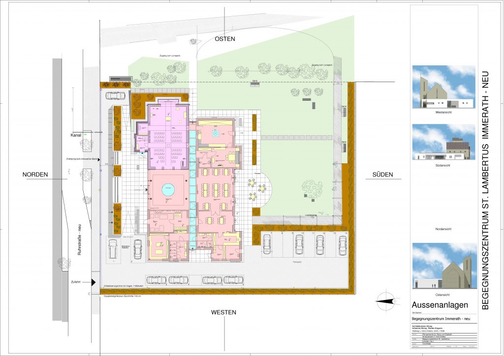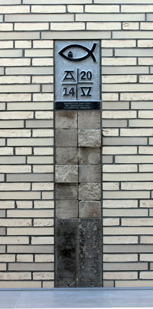 Traditionell sollte der sandsteinfarbene Klinker der Kapelle an die alte Kirche, ein langer, überdachter Flur zwischen Kirchenraum und Begegnungsstätte an eine Gasse in Immerath (alt) erinnern und ausgewählte Einrichtungsstücke aus der alten Lambertuskirche sich harmonisch in die Gesamtstruktur eingliedern.