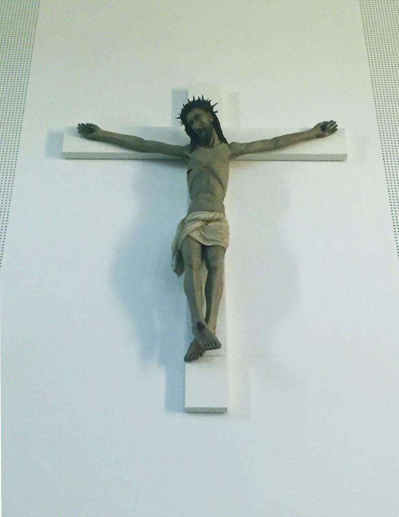 An den Seitenwänden hängen Apostelkreuze, die aus dem Blei des Daches der alten Kirche gestaltet wurden. Die vier Engel, die auf dem Chorgestühl der alten Kirche standen, schmücken die südliche Wand, das alte barocke Kruzifix hängt an einem weißen modernen Kreuz an der Nordwand.