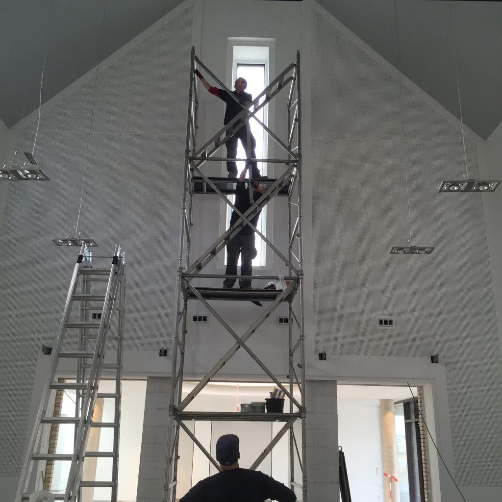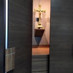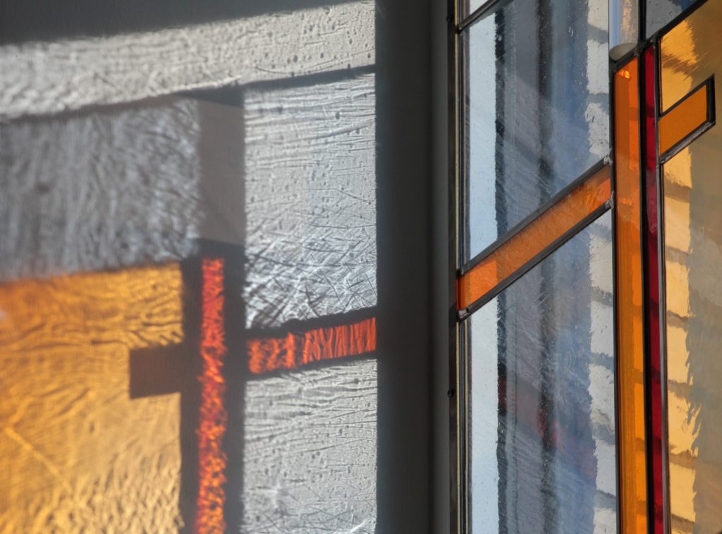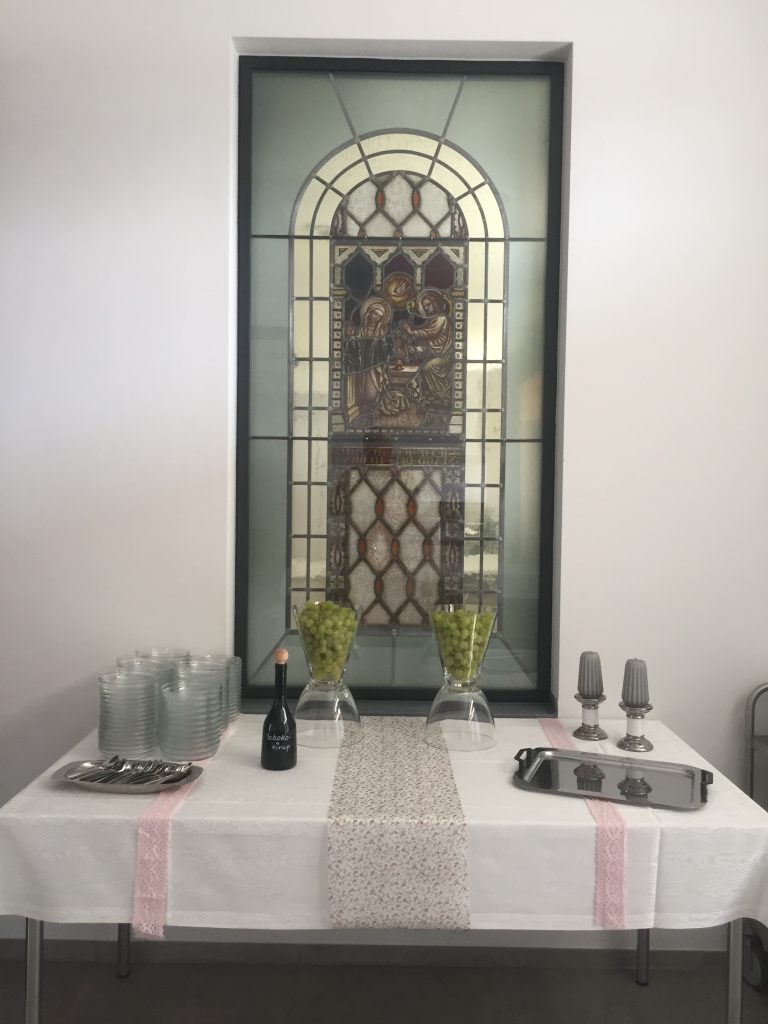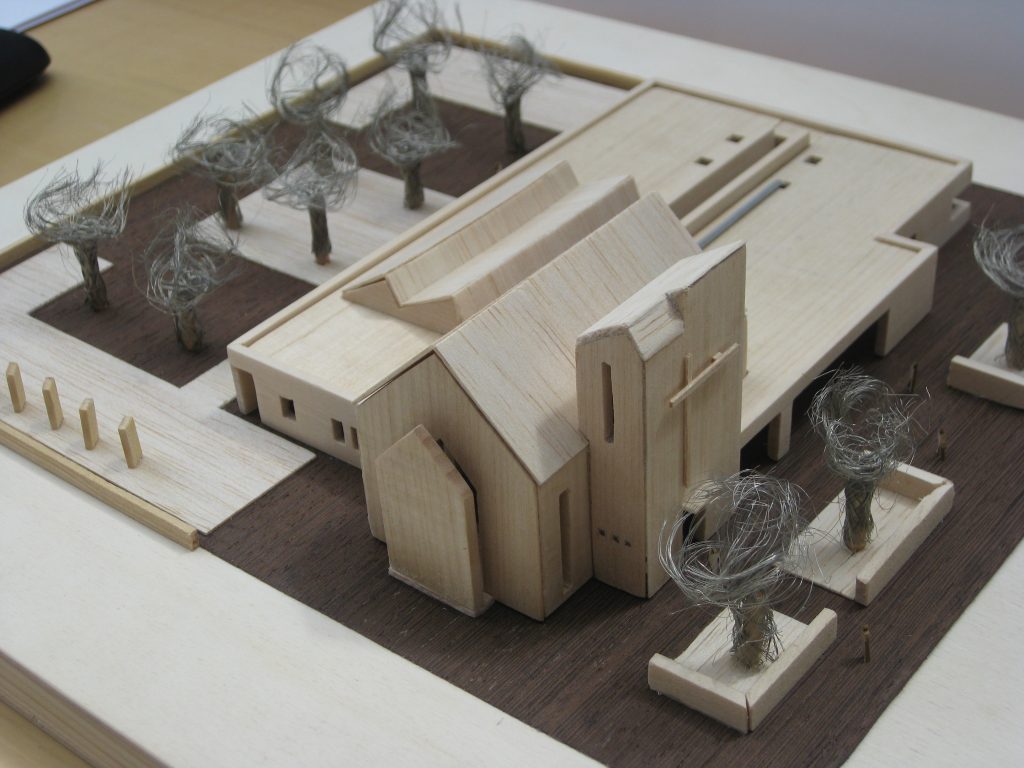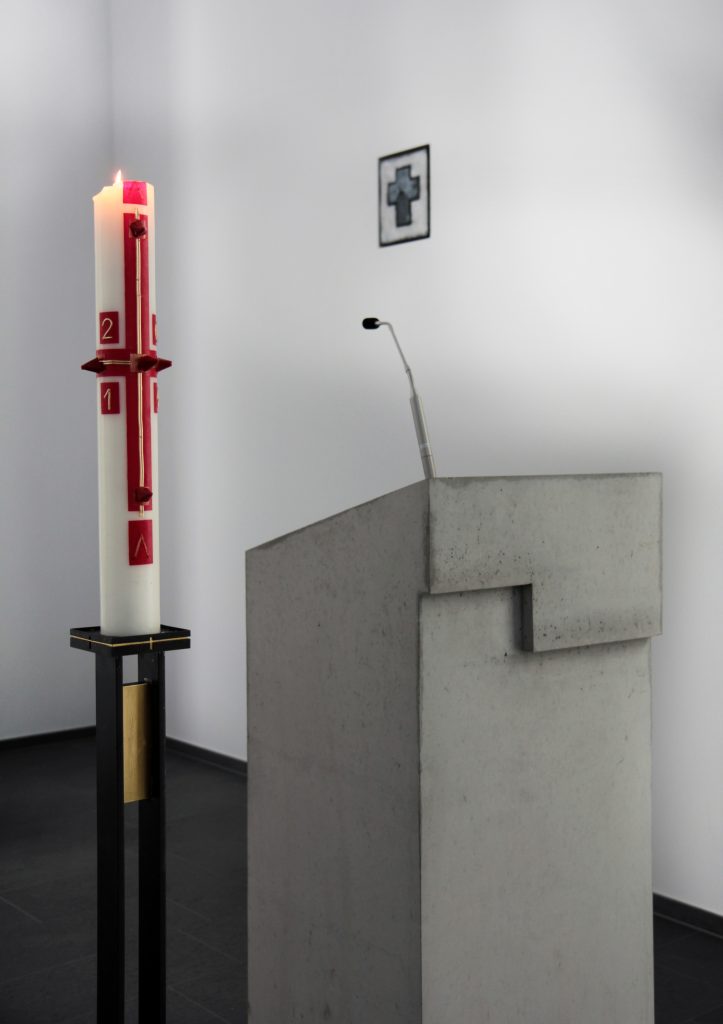 - Begegnungstrakt mit Sakristei, die gleichzeitig auch als Taufkapelle genutzt wird, kleiner und großer Versammlungsraum, Küche und Toilette.