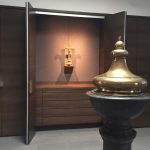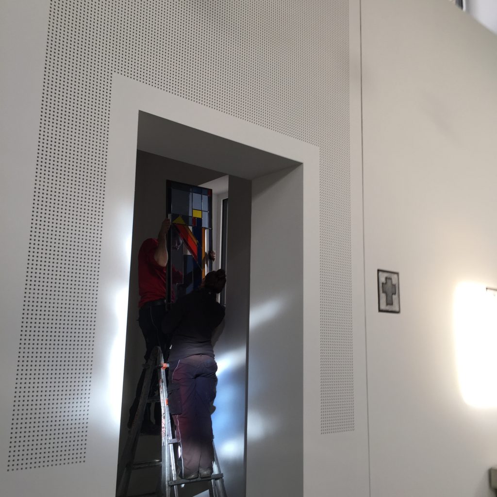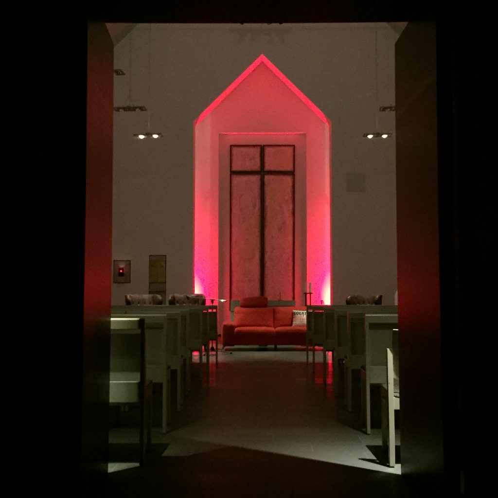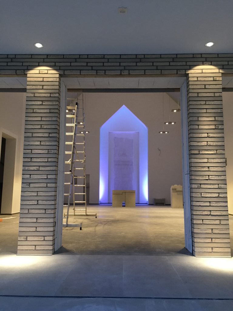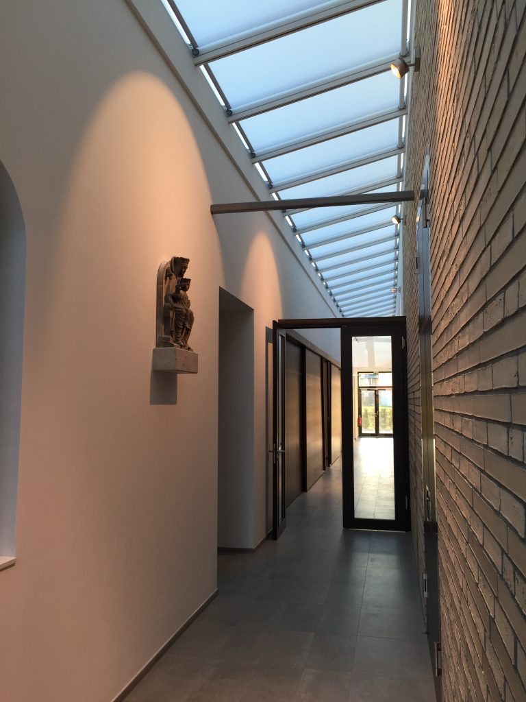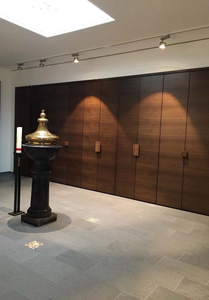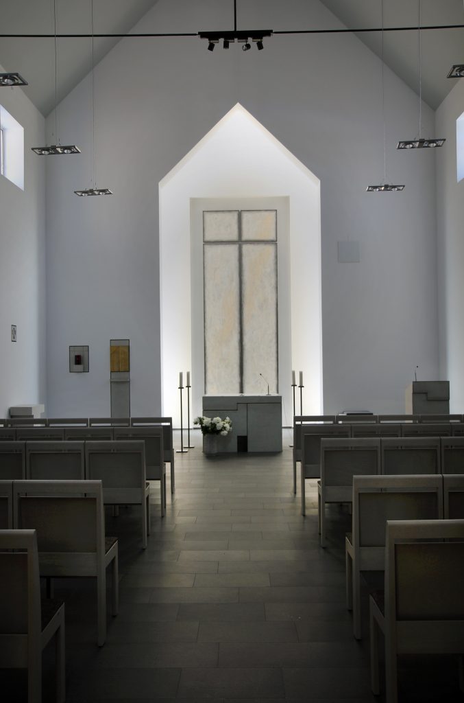 Modern sollte die Innengestaltung, die Raum- und Lichtgebung sowie das Gebäudemanagement werden. Kapelle und Begegnungsstätte wurden so miteinander verbunden, dass die Räume geöffnet werden können und großen Feierlichkeiten genügend Platz bieten.