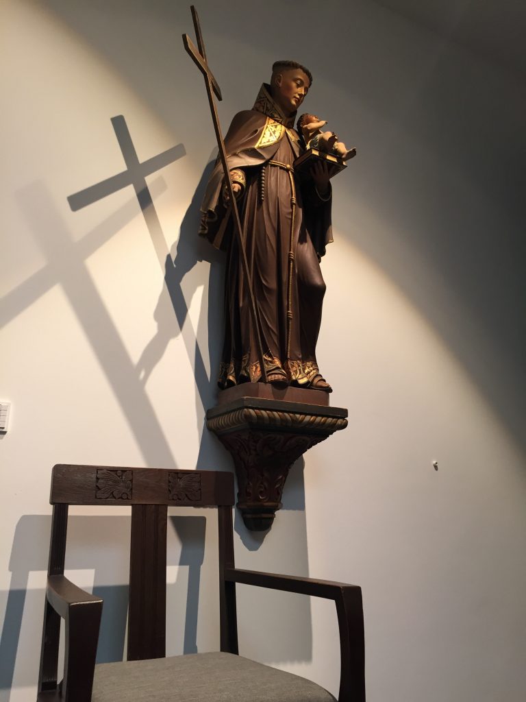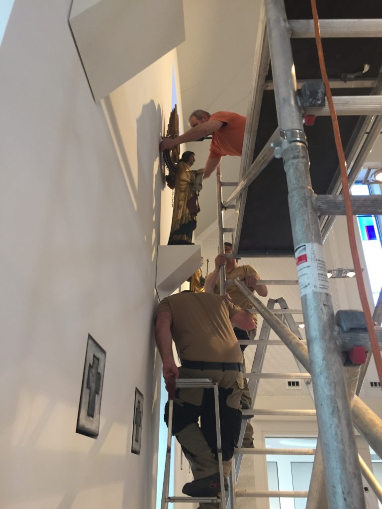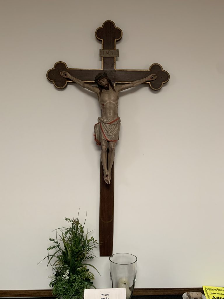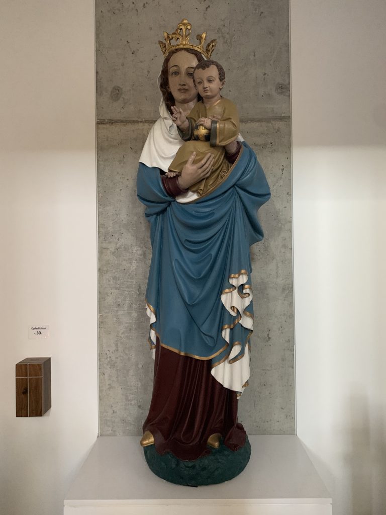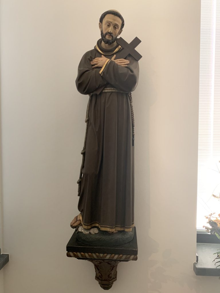 Zudem wurden noch der Heilige Franziskus von Assisi, die vier Passionsengel, ein Schrank, zwei Figuren aus der Außenfassade und die Glocke an der Sakristeitür mitgenommen. Die Beschreibung dieser Einrichtungsgegenstände findet man hier. In der alten Kirche hingen auch die Hinweisschilder, die die Kirchenbesucher darauf hinwiesen, auf welcher Seite die Frauen und die Männer zu sitzen hatten. Bis zum 2. Vatikanischen Konzil waren die Geschlechter in der Kirche streng getrennt. Diese Schilder bezeichnen heute die Herren- und Damentoiletten.