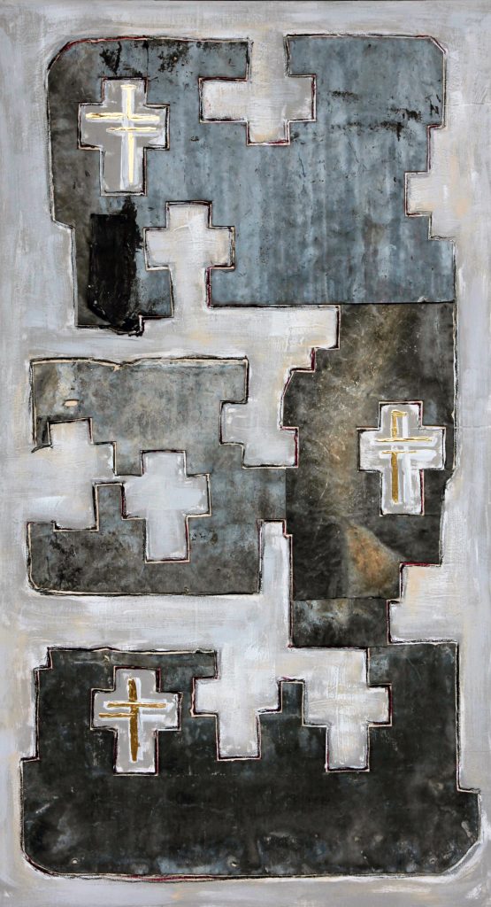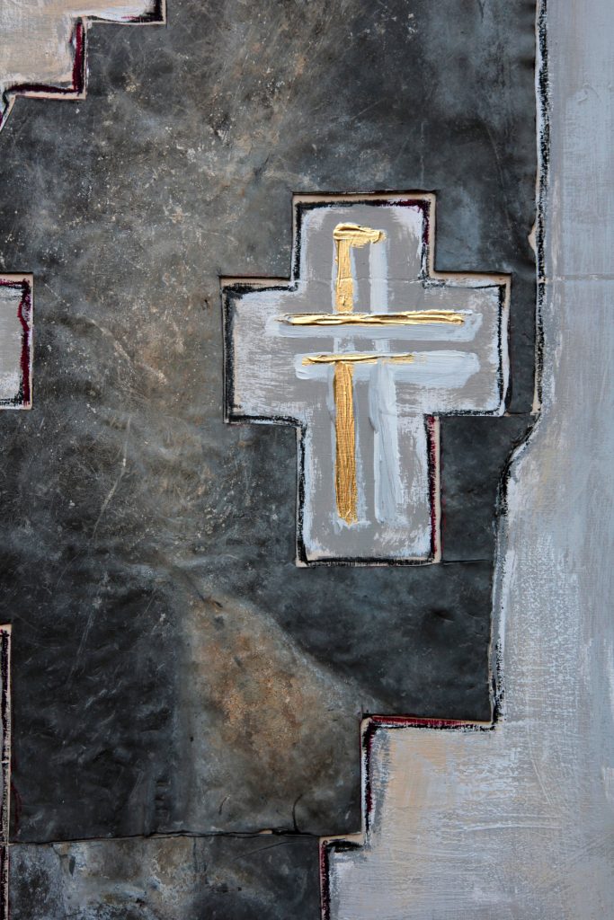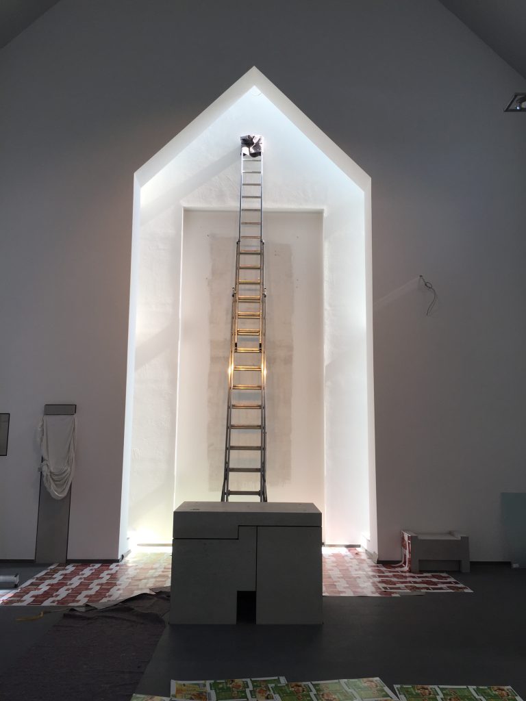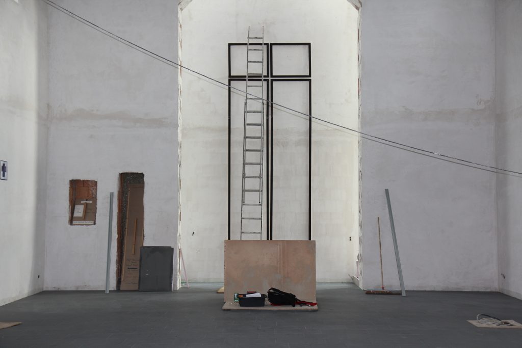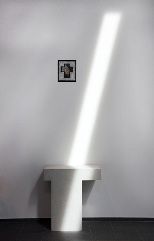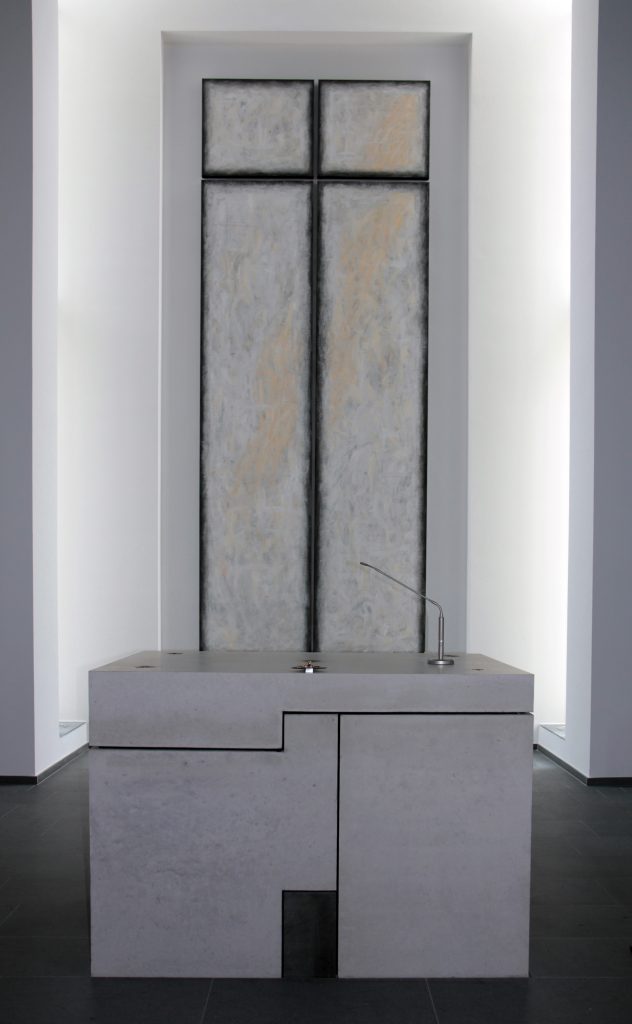 In einer hausförmigen und seitlich beleuchteten, eine Apsis andeutende, Wandausbuchtung befindet sich das Altarbild. Es besteht aus vier Leinwandbildern, die auf Abstand zueinander aufgehängt wurden und dadurch die Gestalt eines Kreuzes bilden. (Bild 1 und 2) In Querrichtung durchzieht das gesamte Bild eine ockerfarbene Linie. Sie „hebt den Blick des Betrachters zusätzlich nach oben und verstärkt die transzendente Wirkung des Altarbildes“4.