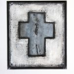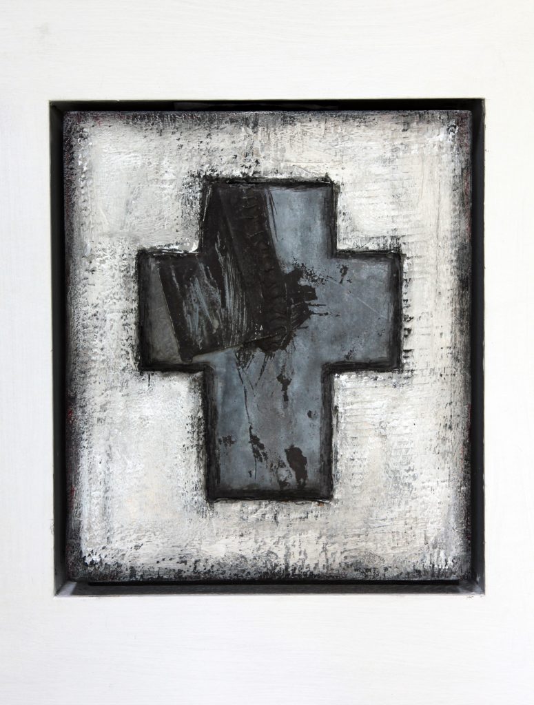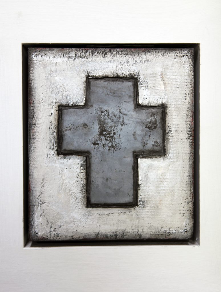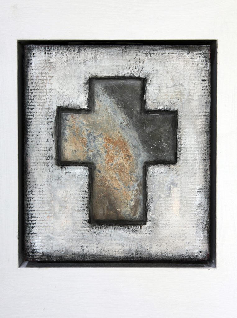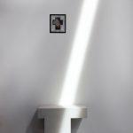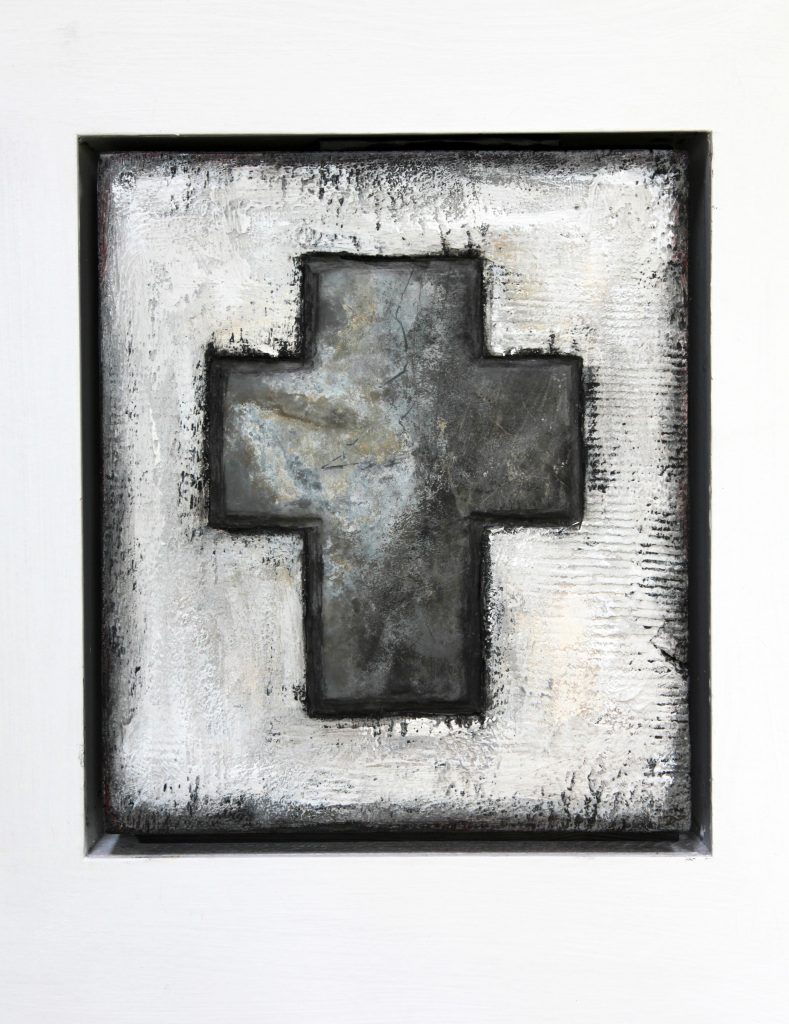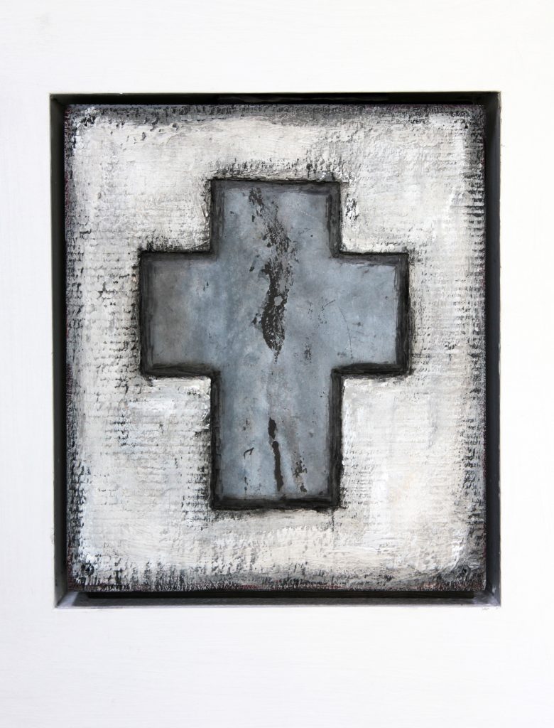 In einer hausförmigen und seitlich beleuchteten, eine Apsis andeutende, Wandausbuchtung befindet sich das Altarbild. Es besteht aus vier Leinwandbildern, die auf Abstand zueinander aufgehängt wurden und dadurch die Gestalt eines Kreuzes bilden. (Bild 1 und 2) In Querrichtung durchzieht das gesamte Bild eine ockerfarbene Linie. Sie „hebt den Blick des Betrachters zusätzlich nach oben und verstärkt die transzendente Wirkung des Altarbildes“4.