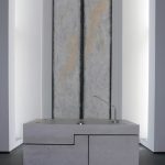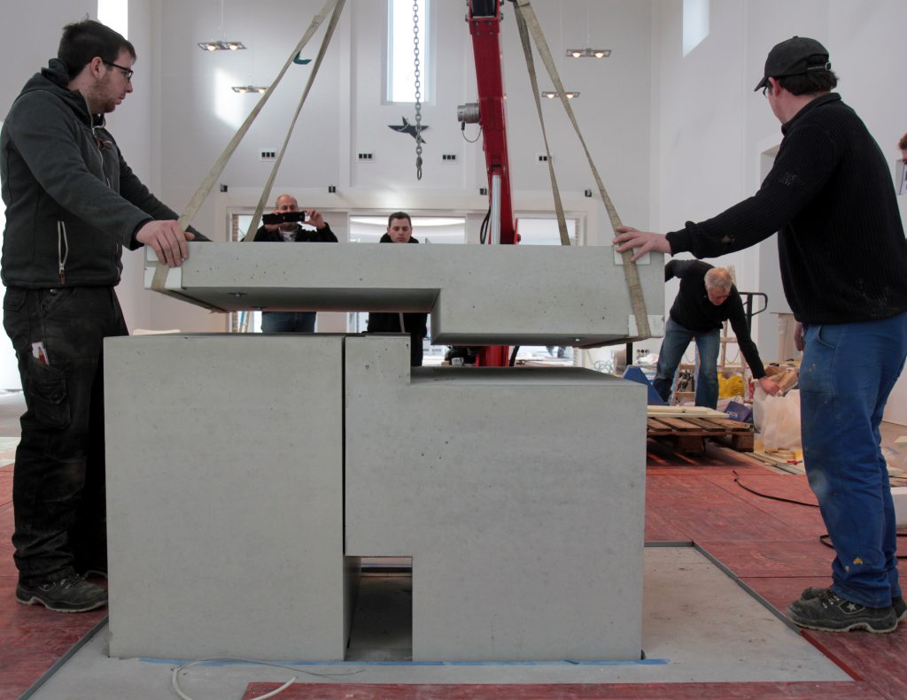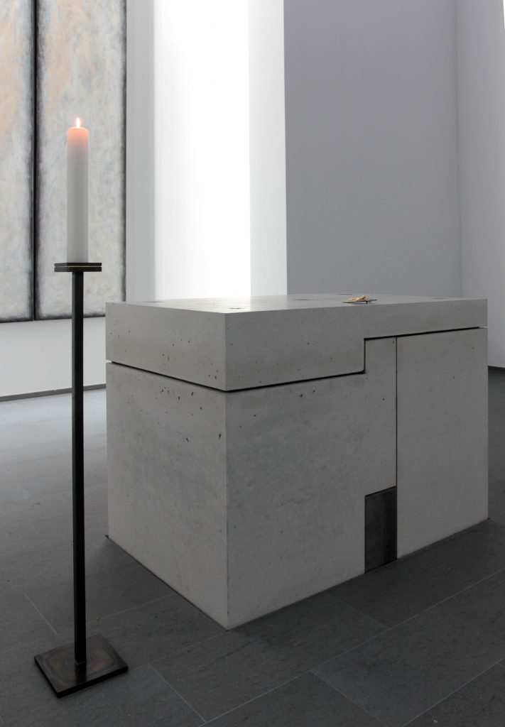 Der Altartisch besteht aus Beton. (Bild 2, 3 und 4) Herr Laufs versuchte im Altar die Forderung der deutschen Bischofskonferenz umzusetzen, in den Kirchengegenständen den Glanz der Einfachheit wirken zu lassen.5 Der Altar besitzt eine „blockhafte, monolithische Gestalt“6, enthält aber eine Linienführung, „die den Aspekt des Zusammengefügten betonen soll“7. Im unteren Teil wurde eine dunkle Granitplatte eingefügt, hinter der sich die Reliquien in einem Holzkasten befinden. Beide stammen aus der alten Lambertuskirche. (Bild 3)