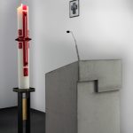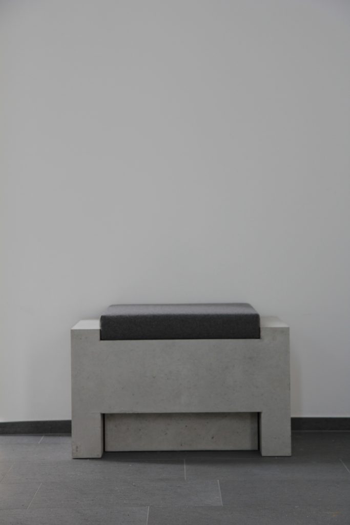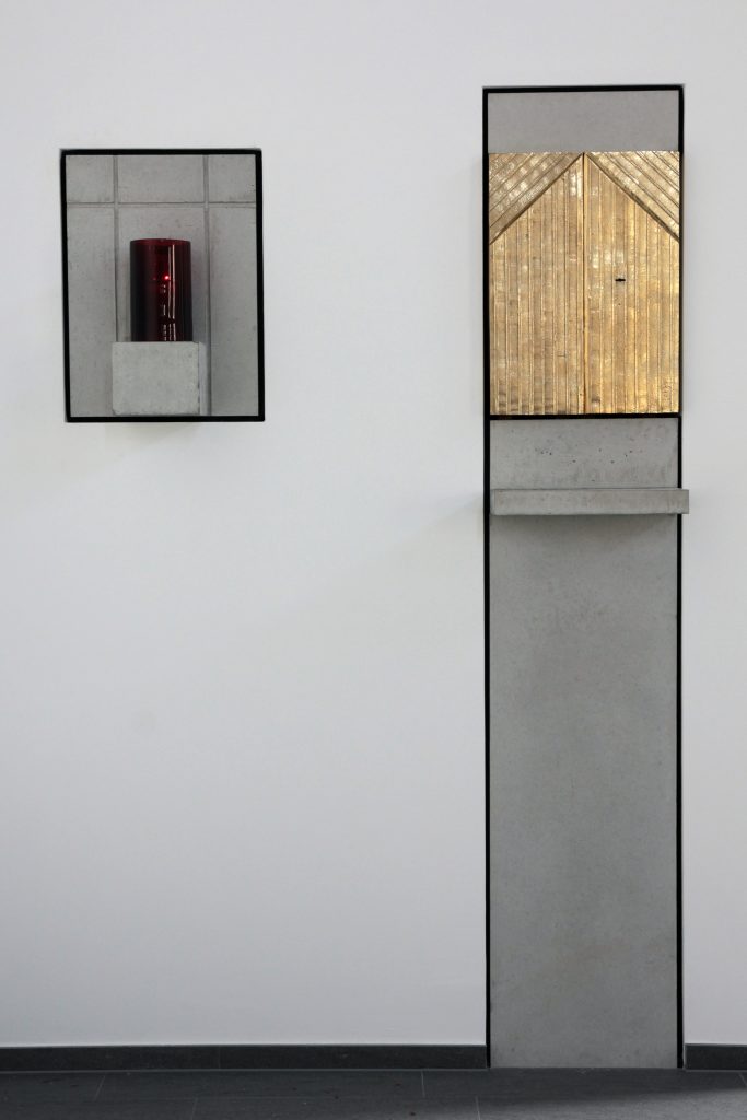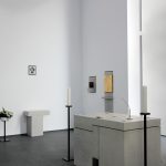 Zum Altarraum gehören noch ein Ambo (Bild 8), zwei Bänke und Kerzenständer (Bild 3, 4 und 7), die teilweise aus dem gleichen Material wie der Altar bestehen und eine ähnliche Linienführung besitzen. Auch der Tabernakel, die Ablage des Messlektionars und das ewige Licht (Bild 5, 6 und 9), die in der Ostwand neben dem Altar eingearbeitet sind, fügen sich harmonisch in die künstlerische Gesamtgestaltung ein.