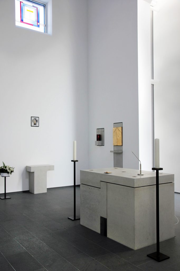 Die künstlerische Gestaltung des Raumes oblag dem Künstler Karl-Heinz Laufs aus Erkelenz. Der Altarraum ist bewusst modern gestaltet.