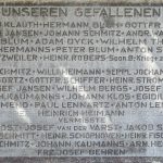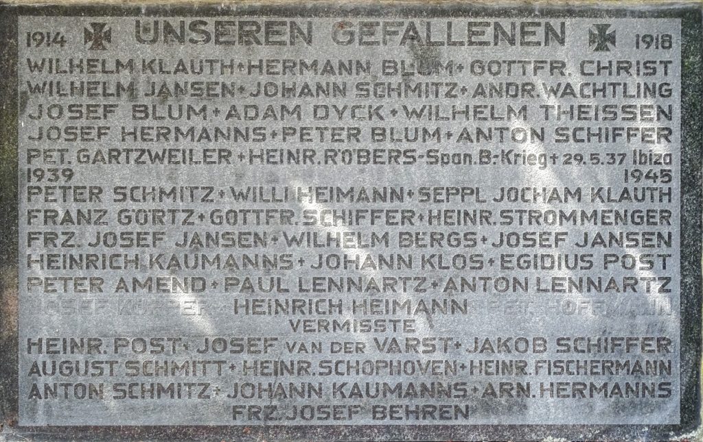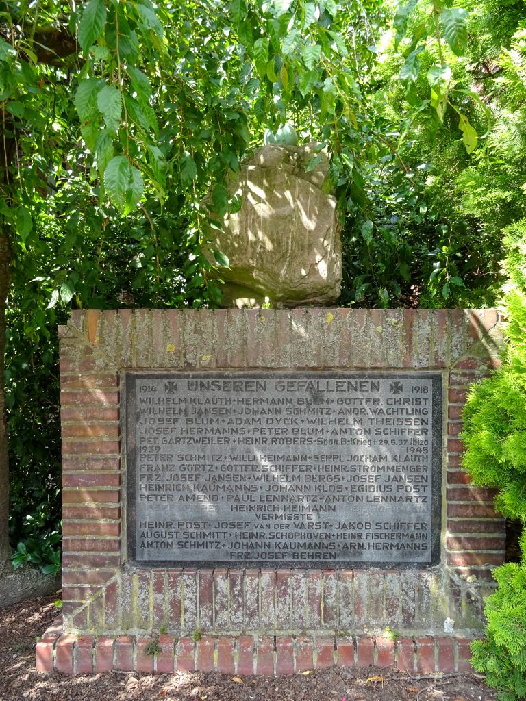 Es ist bekannt, dass das Ehrenmal im Jahre 1952 errichtet und eingeweiht wurde. Von wem es stammt, weiß man nicht. Seit der Errichtung gedenkt die Antonius-Schützenbruderschaft nach dem sonntäglichen Schützenfesthochamt hier ihrer Toten und legt einen Kranz nieder. Anschließend erfolgt der Große Zapfenstreich mit Kirchenparade.1