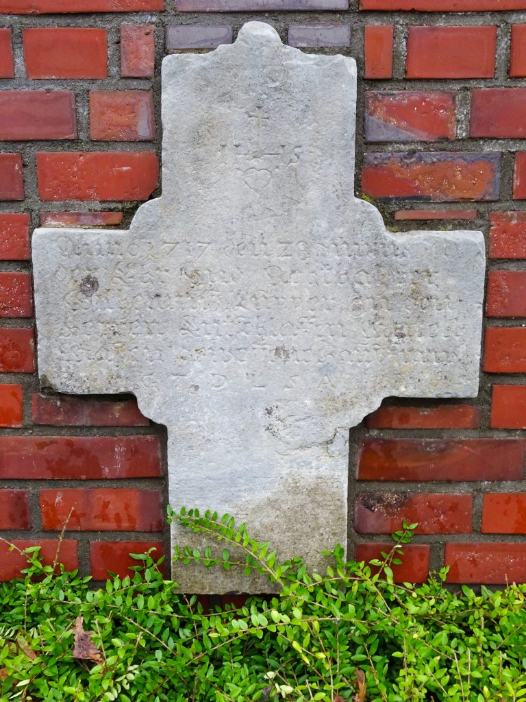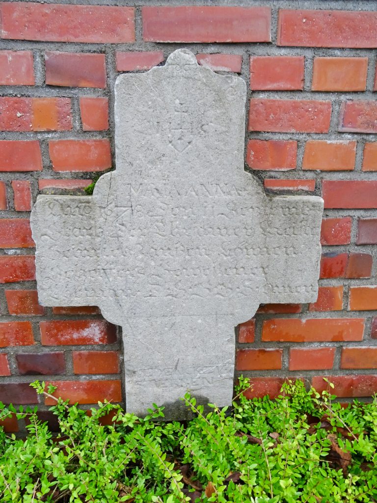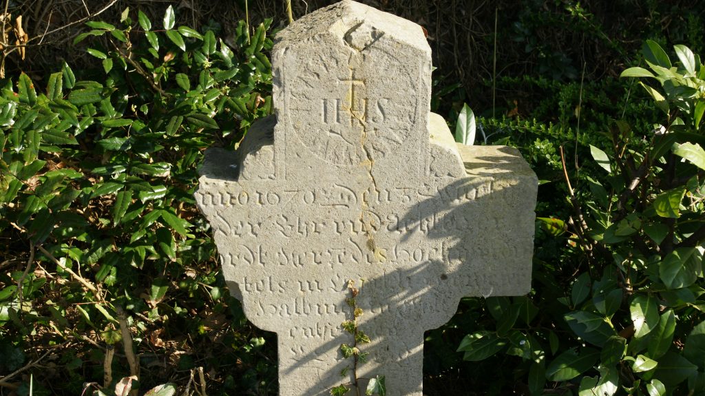 Aus der Zeit des 17. und 18. Jahrhunderts blieben noch 13 barocke Grabsteine erhalten. Sie befanden sich an unterschiedlichen Stellen des Friedhofes. Die Blausteinkreuze sind teilweise verwittert, teilweise aber noch gut erhalten. Sie haben die „traditionelle Form alter Barock-Grabsteine – mit meist abgerundeten Nasen an den Balkenenden“4. Sie enthalten Inschriften und teilweise christliche Symbole. Einige Grabsteine wurden auf dem Friedhof in neuen Dorf in die Friedhofsmauer eingearbeitet.