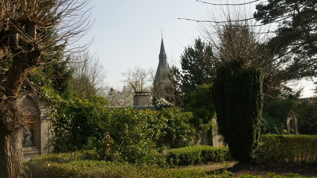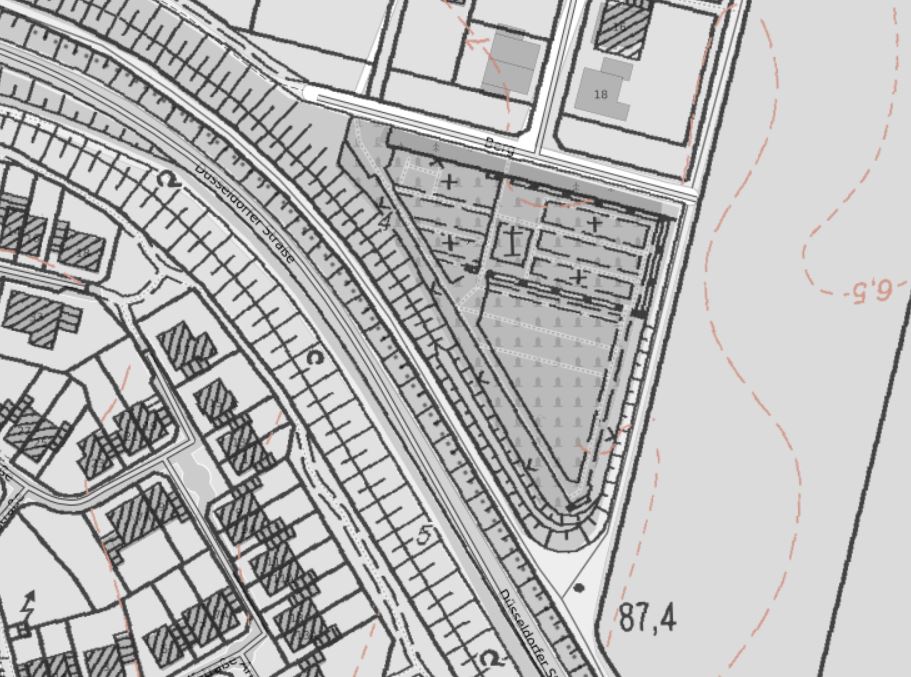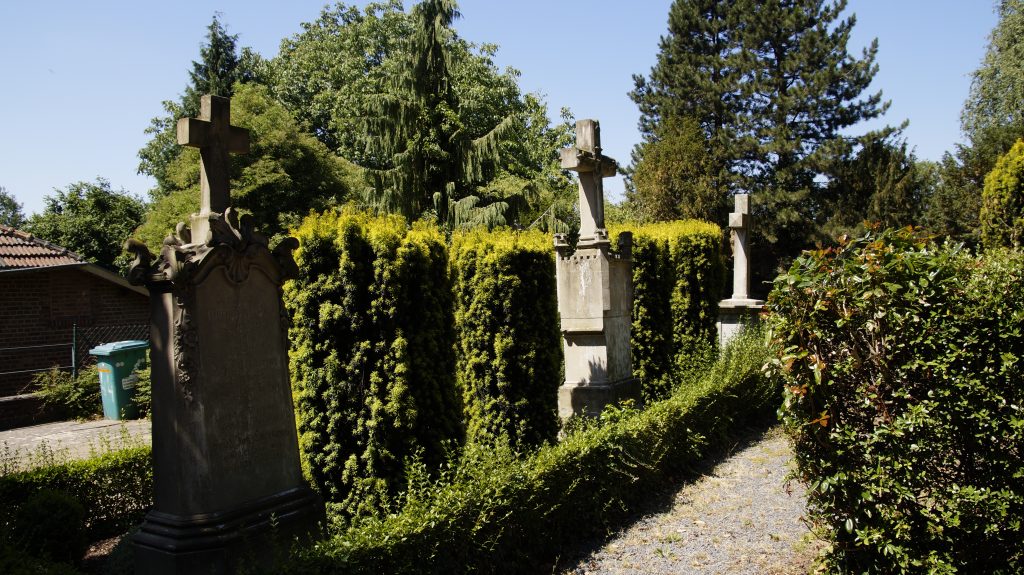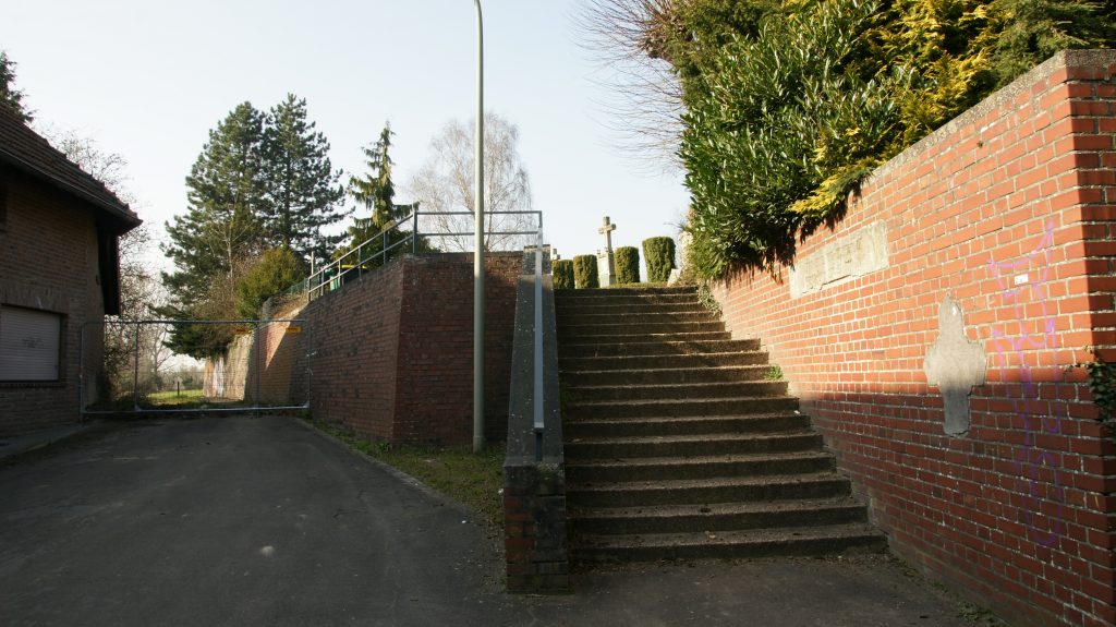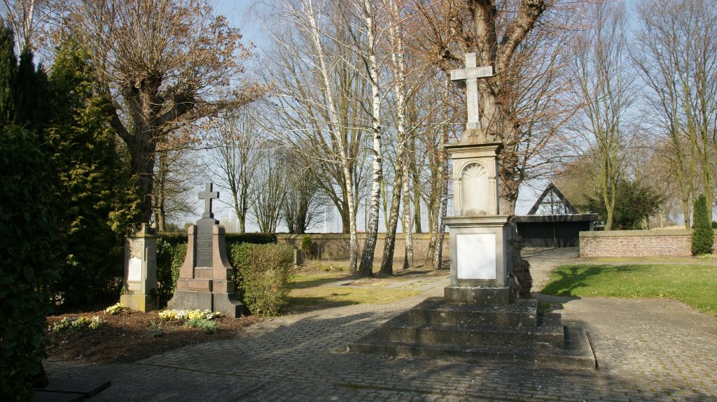 Der Friedhof liegt südöstlich am Dorfrand, direkt nördlich hinter der Düsseldorfer Straße in Erkelenz.