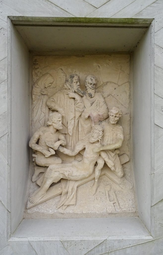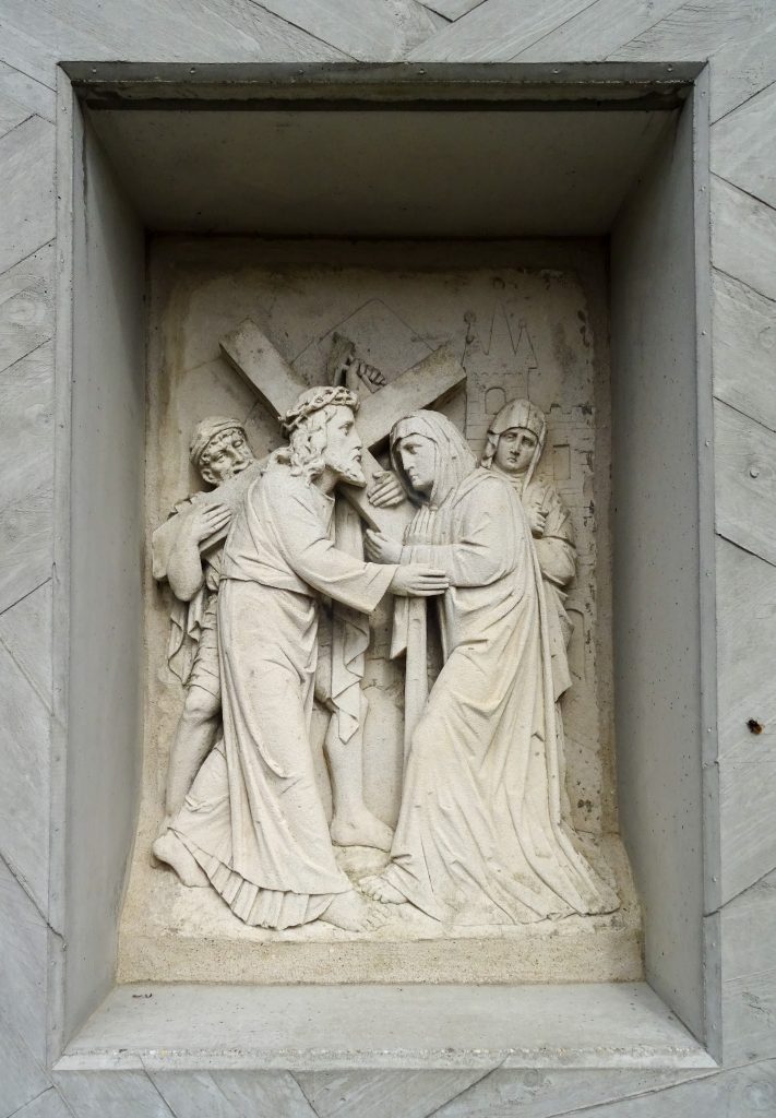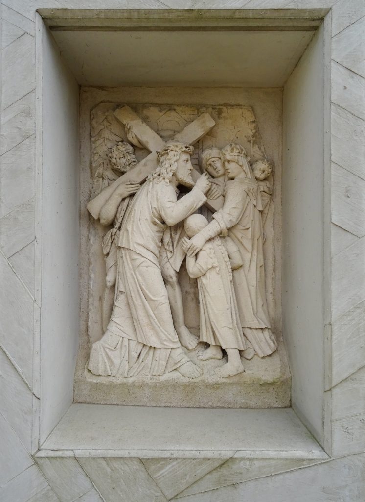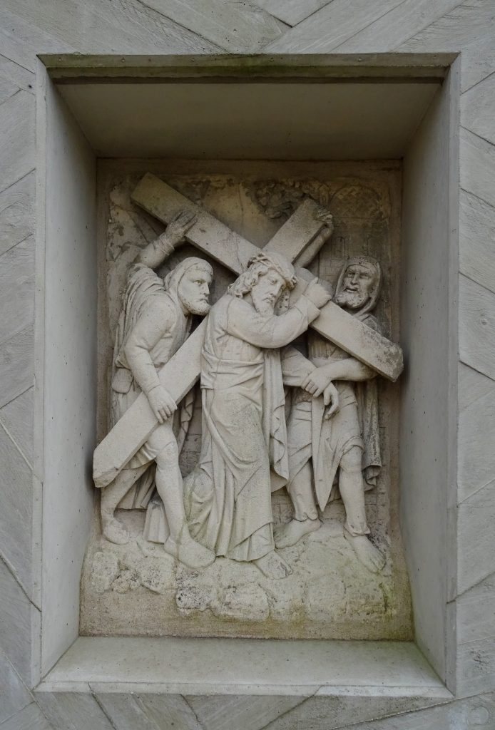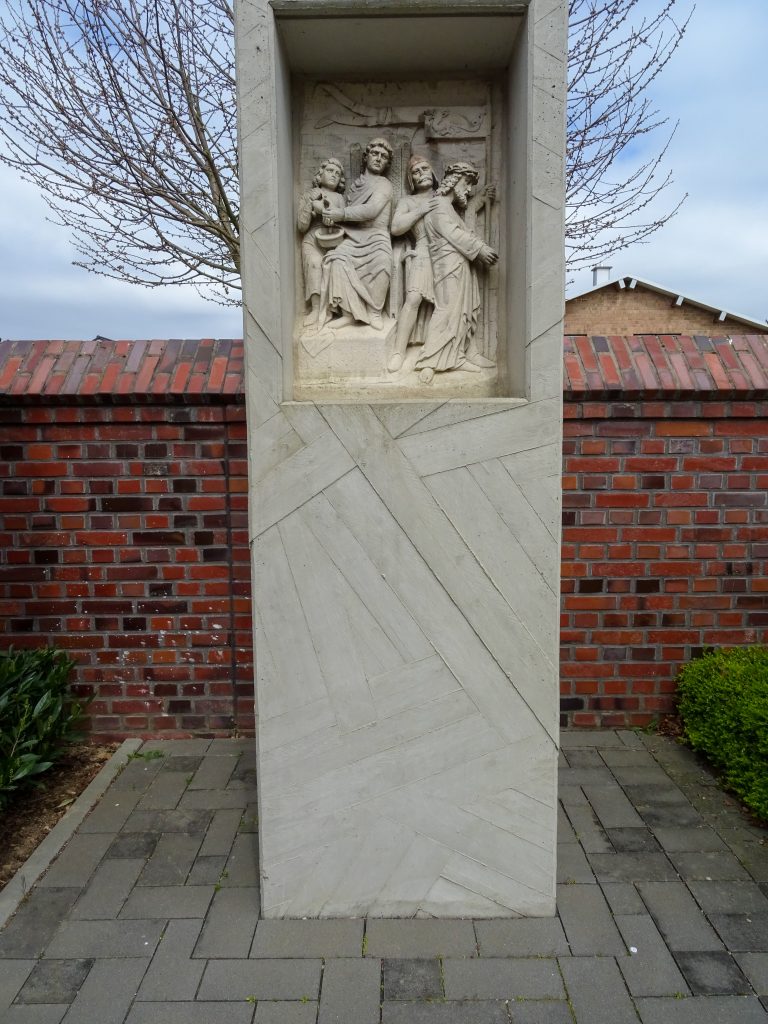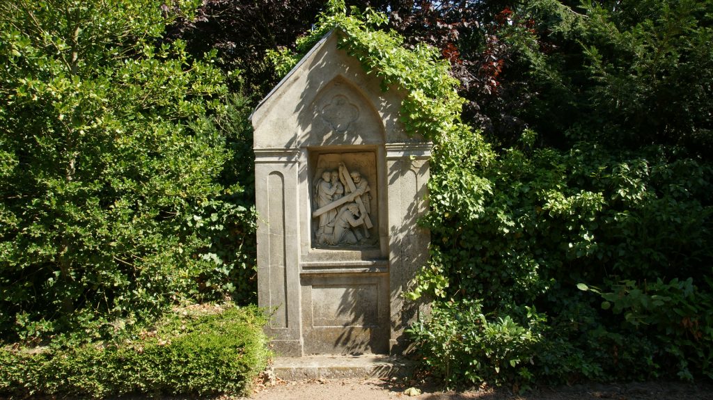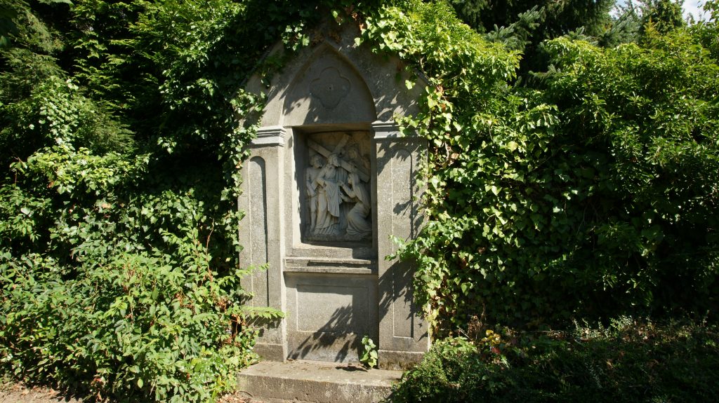 Auf dem Friedhof im neuen Ort wurden die Kreuzwegstationen ebenfalls an der Randmauer des Eingangsteils im Jahre 2016 wieder aufgestellt. Die Relieftafeln wurden allerdings in moderne Stelen eingebaut. Sie sind so hoch, dass man zu ihnen aufschauen muss.