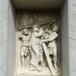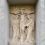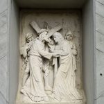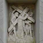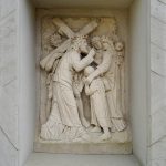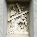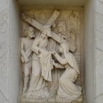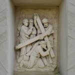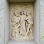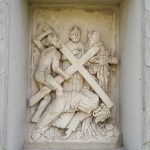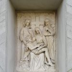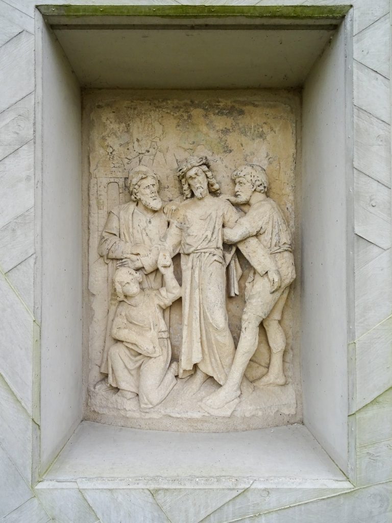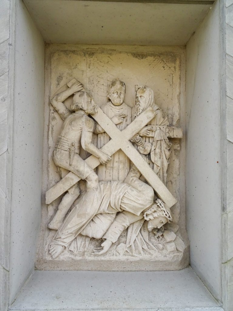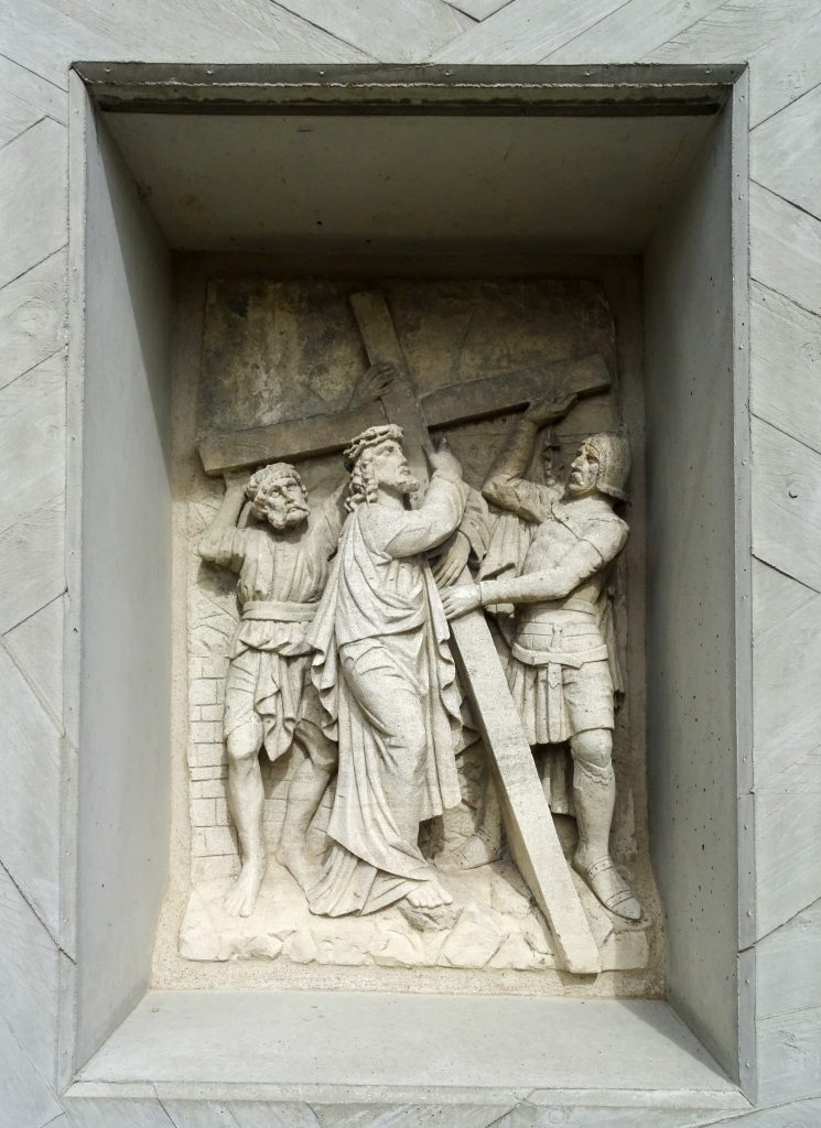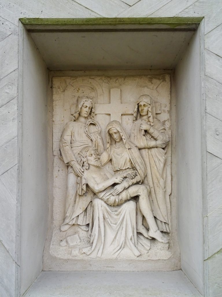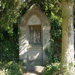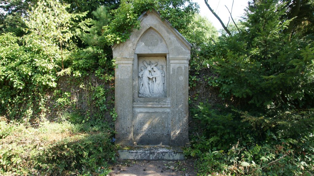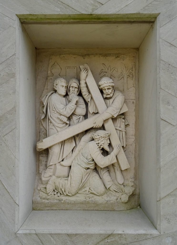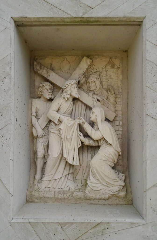 Auf dem Friedhof im neuen Ort wurden die Kreuzwegstationen ebenfalls an der Randmauer des Eingangsteils im Jahre 2016 wieder aufgestellt. Die Relieftafeln wurden allerdings in moderne Stelen eingebaut. Sie sind so hoch, dass man zu ihnen aufschauen muss.