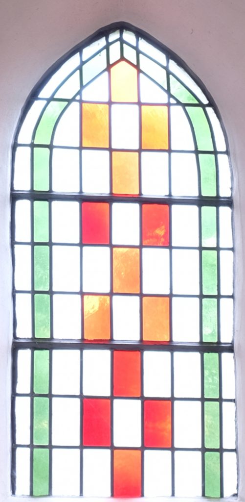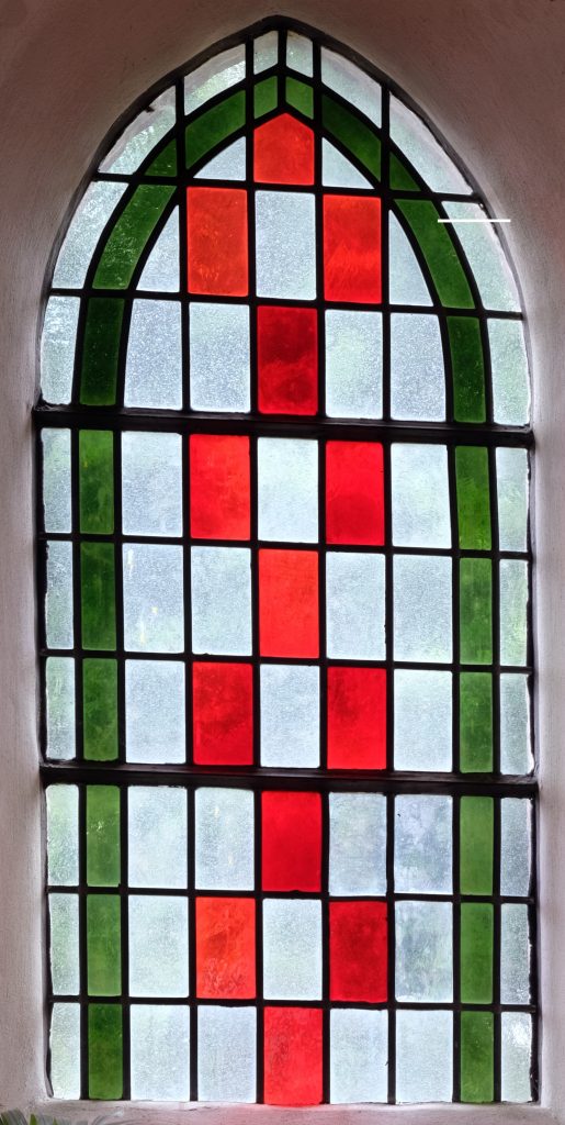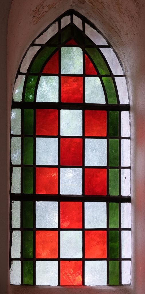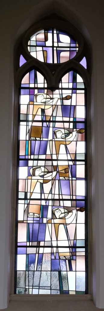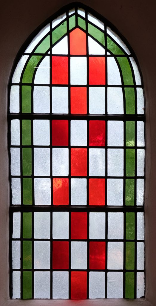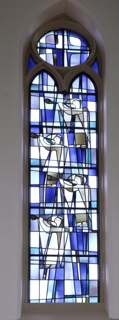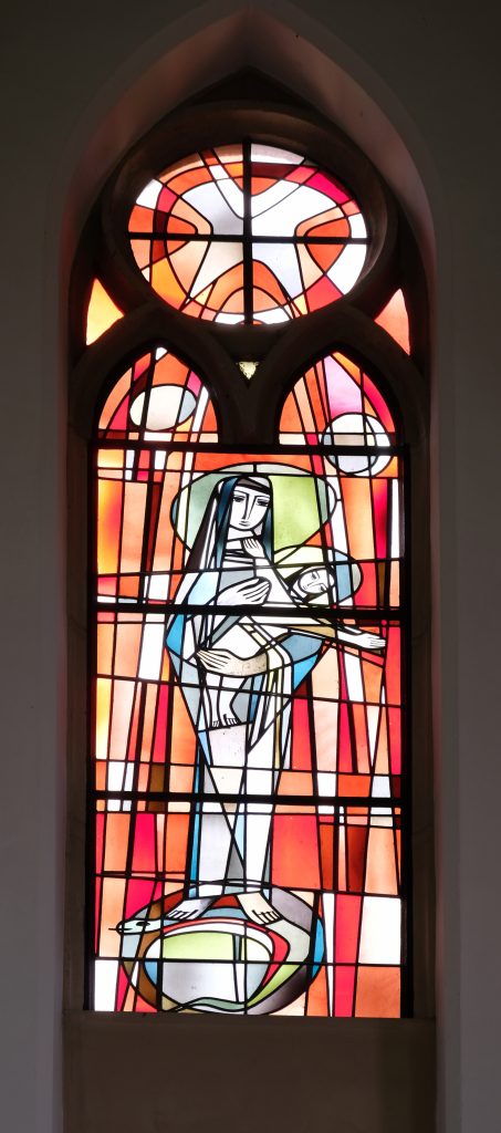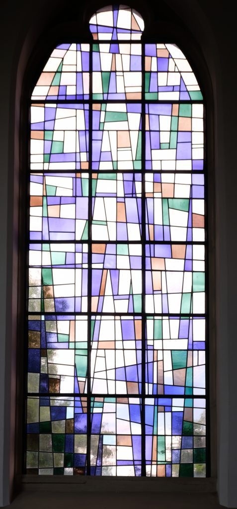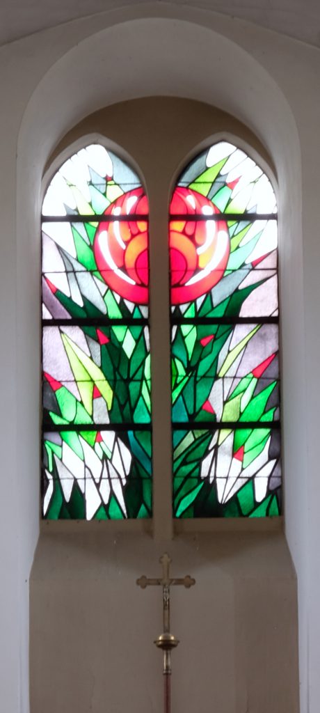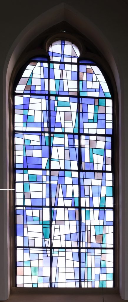 Das Kirchenschiff besitzt auf jeder Seite drei große Spitzbogenfenster aus klarem Glas. Sie geben dem Innenraum einen hellen, sonnendurchströmten Charakter. Motivische Fenster gibt es im Chorraum und an der Turmwand über dem Portal. Die übrigen Fenster im Turmraum, der Kapelle und im Chor weisen Ornamente auf. Wer die motivischen und Ornamentfenster des Chorraumes entwarf, ist in der Literatur nicht eindeutig festgelegt. Dr. Erich Coester nennt Marlene Roubert als Künstlerin und beruft sich auf ein Schreiben des Amtes für Rheinische Denkmalpflege. Die Fenster seien zwischen 1960 und 1970 entstanden.13 Die Forschungsstelle Glasmalerei des 20. Jahrhunderts gibt Peter Thomas als Künstler an, der die Fenster 1958 geschaffen habe.14 Unstrittig ist, dass das Motivfenster über der Eingangspforte von Marlene Roubert stammt. Es wurde 1980 eingebaut.