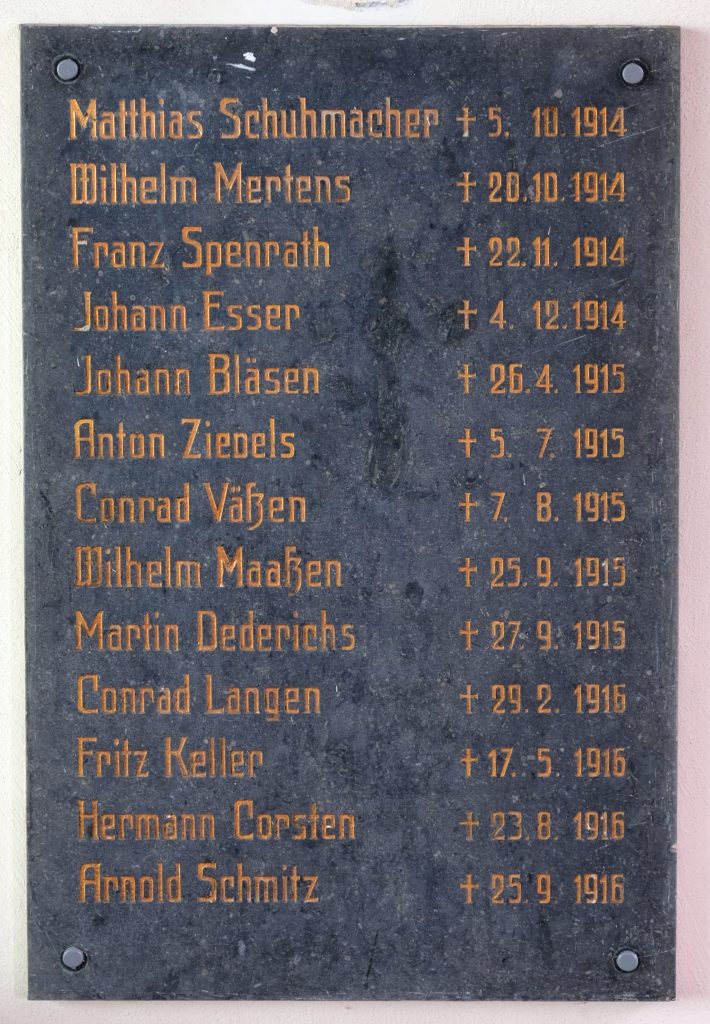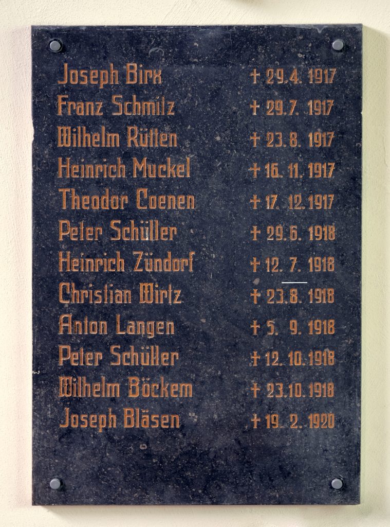 Unter den Heiligenfiguren des heiligen Antonius und Bonifatius hängen die Tafeln mit den Namen der im 1. Weltkrieg Gefallenen. Die Tafel mit den Gefallenen des 2. Weltkrieges hängt in der Sakristei.