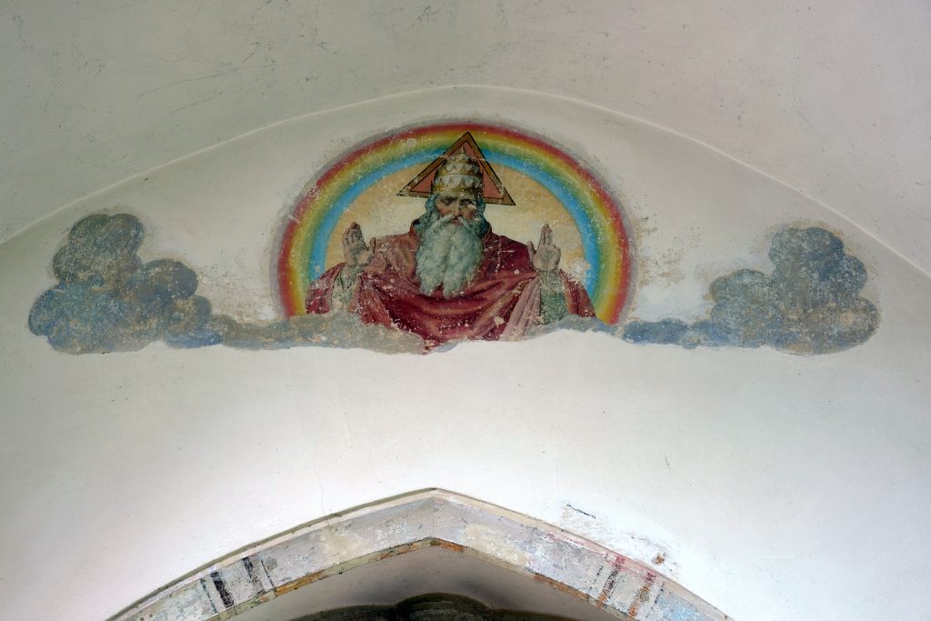 In der Portalhalle befinden sich über dem Fenster an der Ostwand und dem Zugang zur Kapelle Wandgemälde aus dem Jahre 1910, die im Juni 2003 teilweise wieder freigelegt wurden.9 Sie zeigen zum einen das Brustbild eines schwebenden Engels mit ausgebreiteten, segnenden Händen. Auf einem Spruchband kann man noch den Schriftzug „Sünde empfangen“ erkennen. Das zweite Gemälde zeigt Gottvater mit segnend erhobenen Händen. Er wird von einem Regenbogen umrahmt. Die Schriftbänder über dem Eingangs- und Fensterbogen sind nicht mehr lesbar. Die Maler der Kunstwerke sind nicht bekannt. Dr. Erich Coester erkennt in der Darstellung einen stark idealisierenden Naturalismus.10