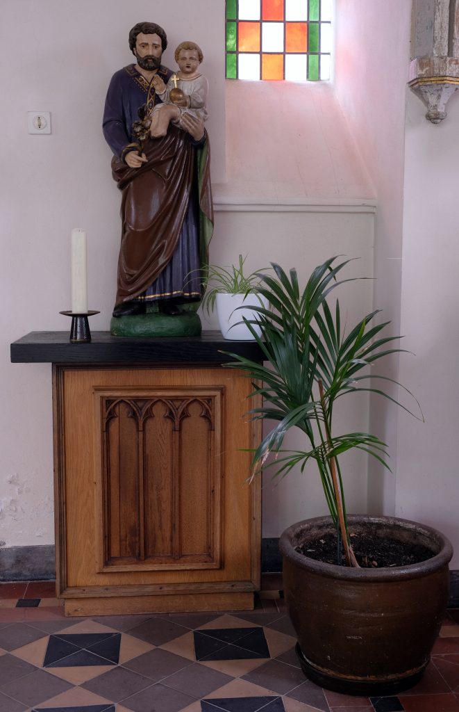 Die östlich neben dem Portal stehende Kredenz besteht aus hellem Holz und wurde ebenfalls um 1900 gefertigt. Vorne sieht man drei Spitzbogenblenden. Auf der Mensaplatte steht Josef mit dem Christuskind.4